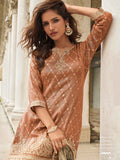 Experience royal elegance with this brown embroidered silk sharara suit, showcasing intricate hand and thread work on the kurta. The richly flared sharara complements the detailed craftsmanship, while the floral digital Chinon dupatta adds a refined contrast. Ideal for festive occasions, evening gatherings, and pre-wedding celebrations, this ensemble combines tradition with sophisticated style.