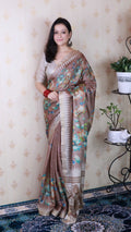 Rich digitally printed Pallu. Paired with Contrast printed plain Blouse.