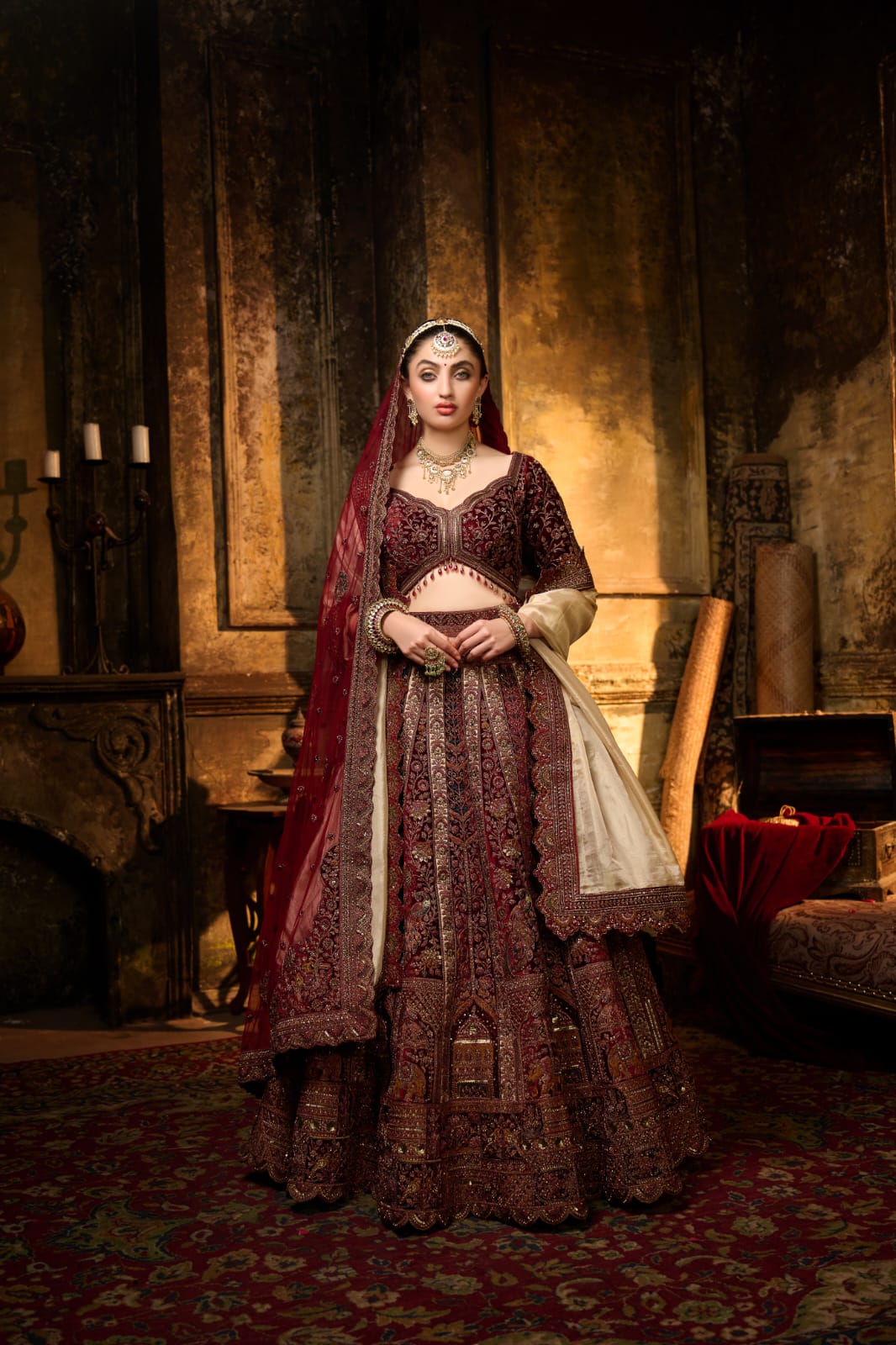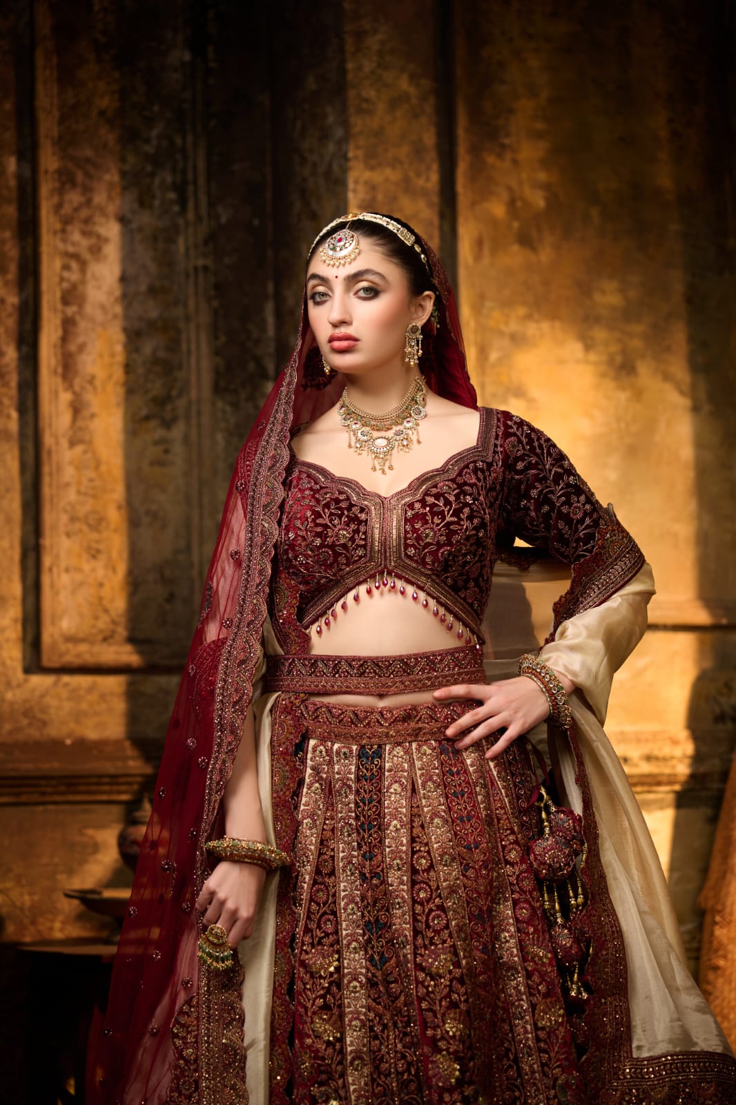 Burgundy & Champagne Gold Bridal Lehenga with Zardozi Embroidery