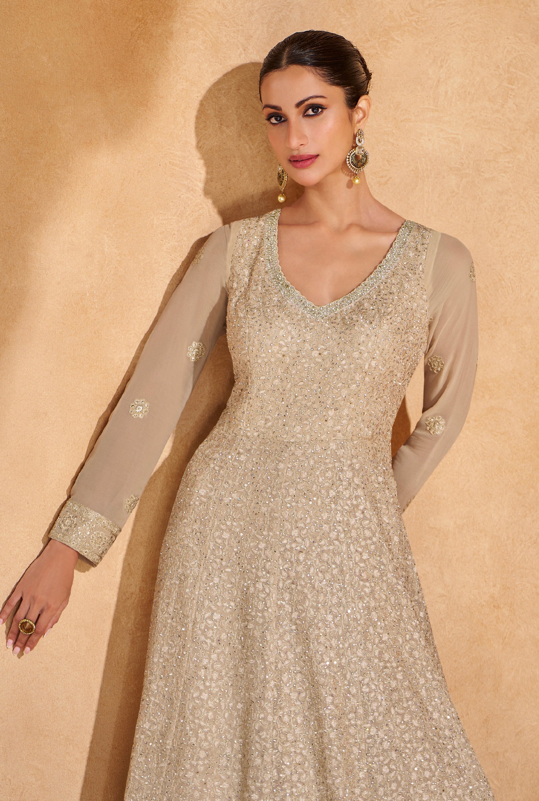The Champagne Gold Chikankari Embroidered Georgette Anarkali is the epitome of royal elegance and opulence. Designed for grand occasions, this outfit features real Georgette fabric and rich chikankari embroidery that elevates its luxurious appeal. The champagne gold shade gives the outfit a regal touch, perfect for evening events, weddings, or formal parties.