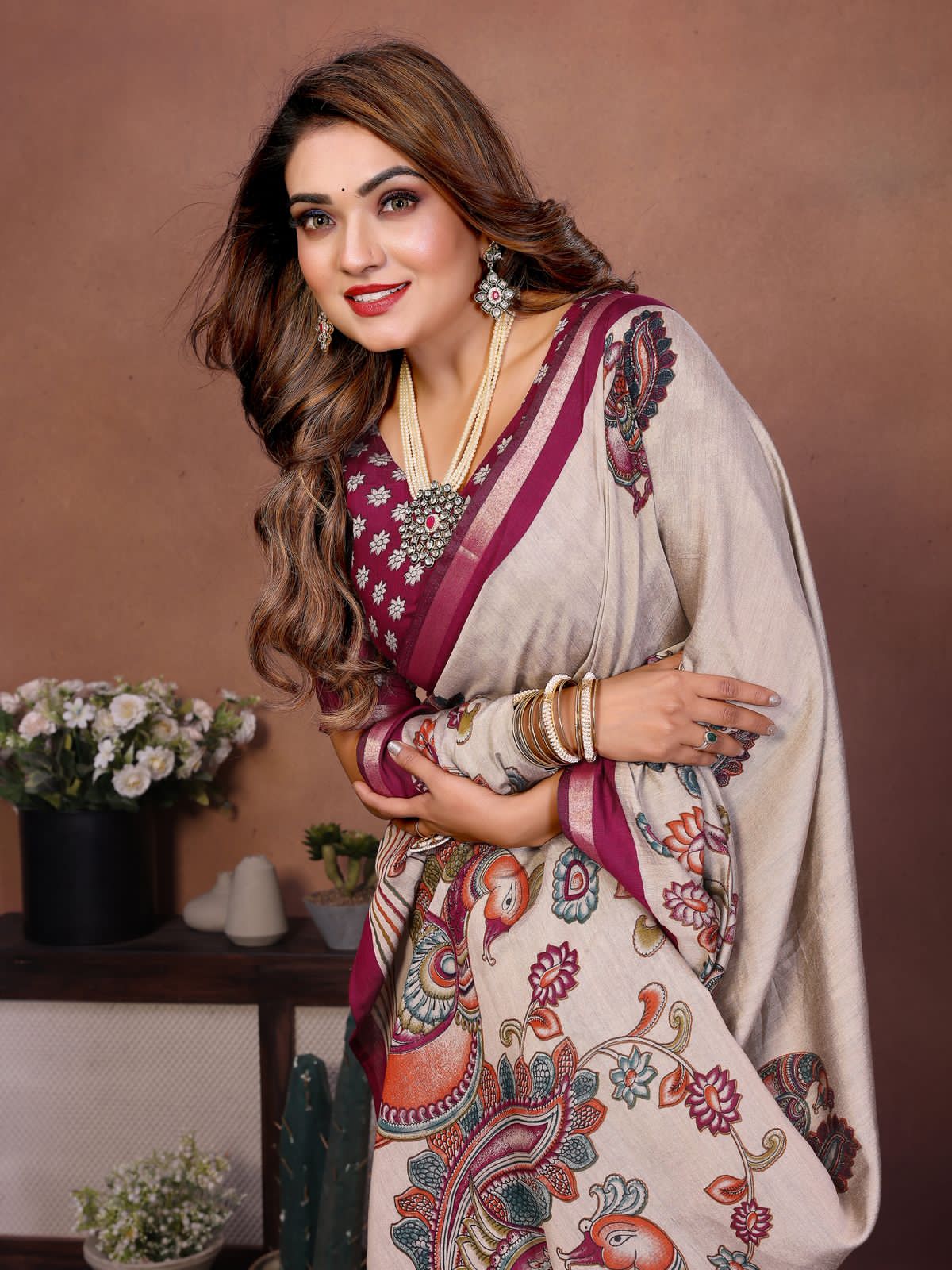 Maroon Cream Pure Soft Mul Kalamkari Print Cotton Saree