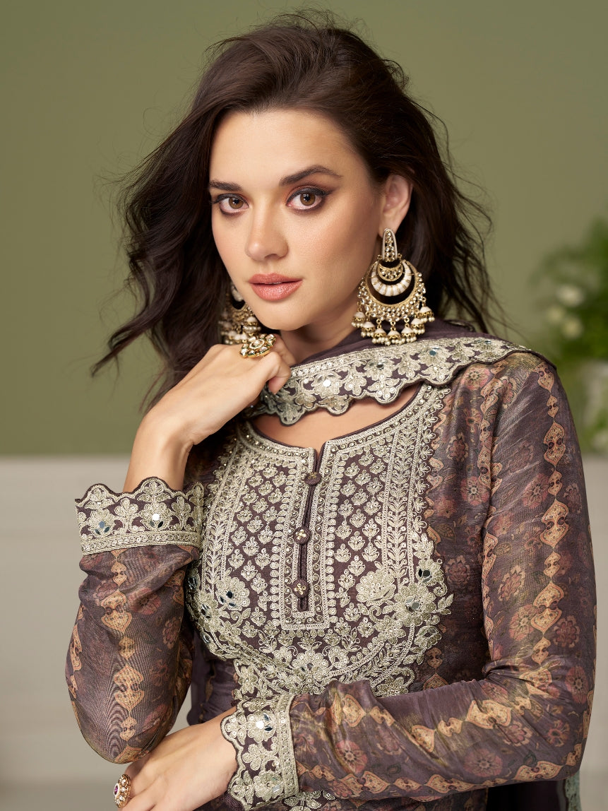 Coffee Brown Real Chinon Digital Print Embroidered Palazzo Suit