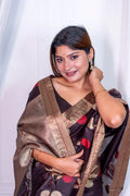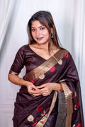 PURE LINEN SILK SAREE WITH TRADITIONAL JAMDANI TYPE WEAVING BORDER AND CLASSIC FLORAL TYPE WEAVING PATTERN ON IT AND ZARI PALLU WITH FANCY TASSELS AND RUNNING BROCADE BLOUSE PIECE