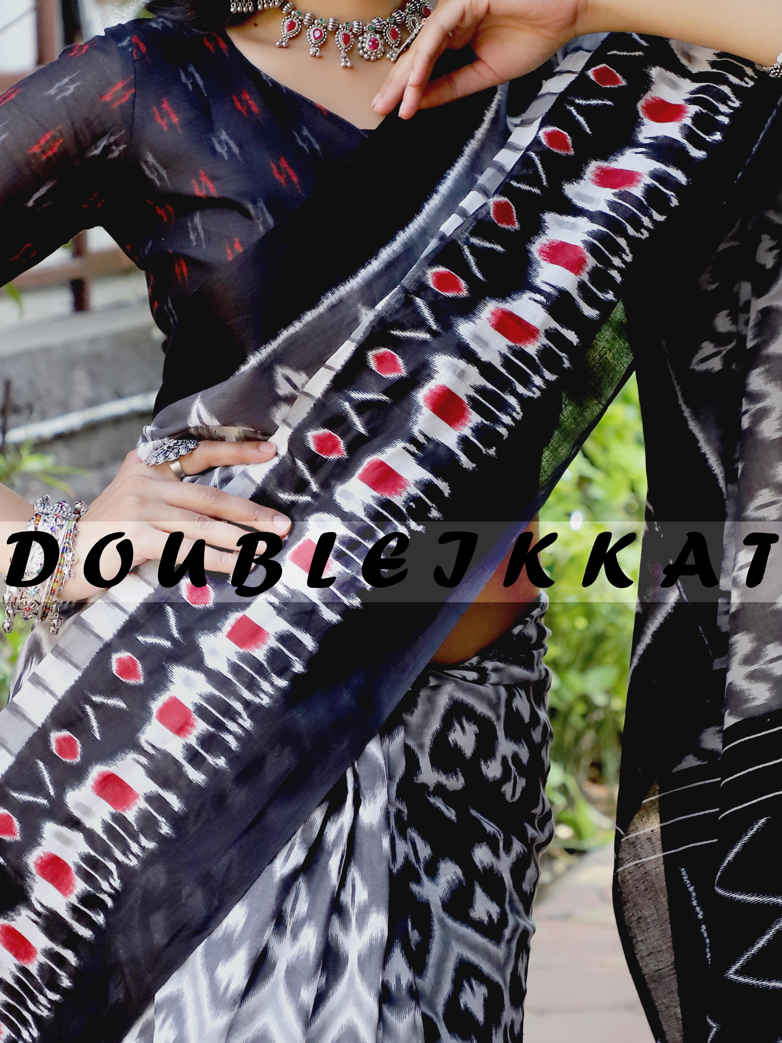 SAREES : Dobule Ikkat Jaipur Block Printed Sarees 5.5Mtr And 0.80 Printed Blouse pice