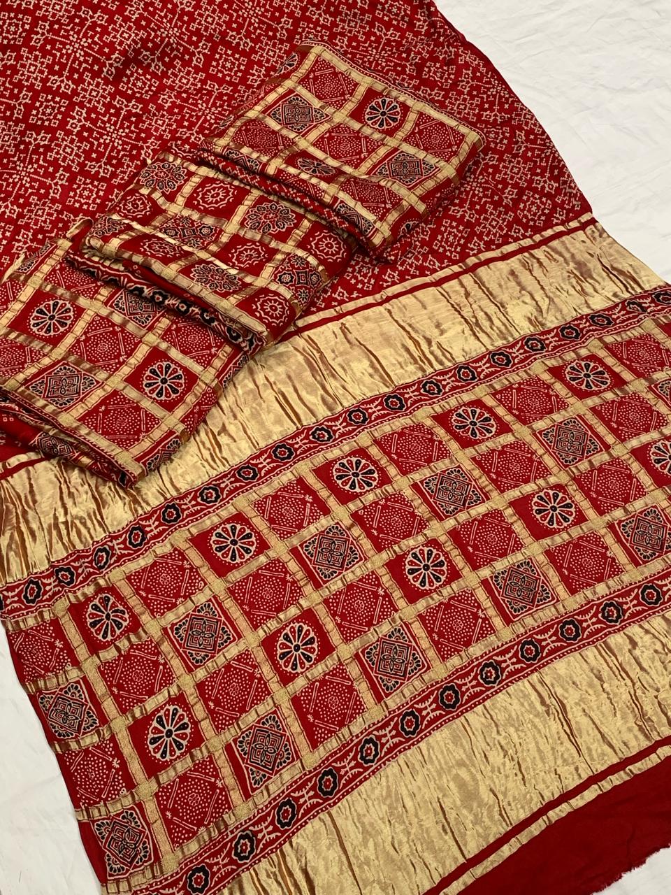 Beautiful Designer Pure Gajji Ajrakh Bandhej Morpis Saree