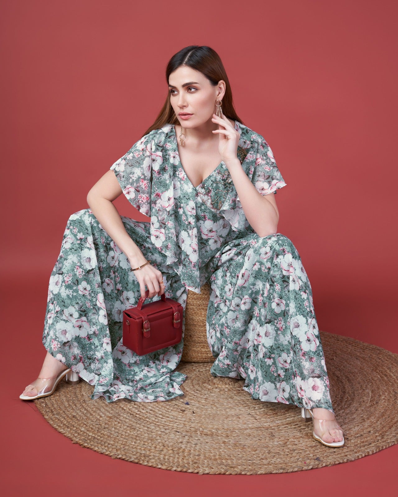 Pastel Green Multi-Printed Crepe Silk Palazzo Suit loading