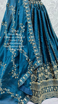 This teal and gold lehenga features intricate embroidery and mirror work, paired with a pink dupatta for a stunning, regal look.
