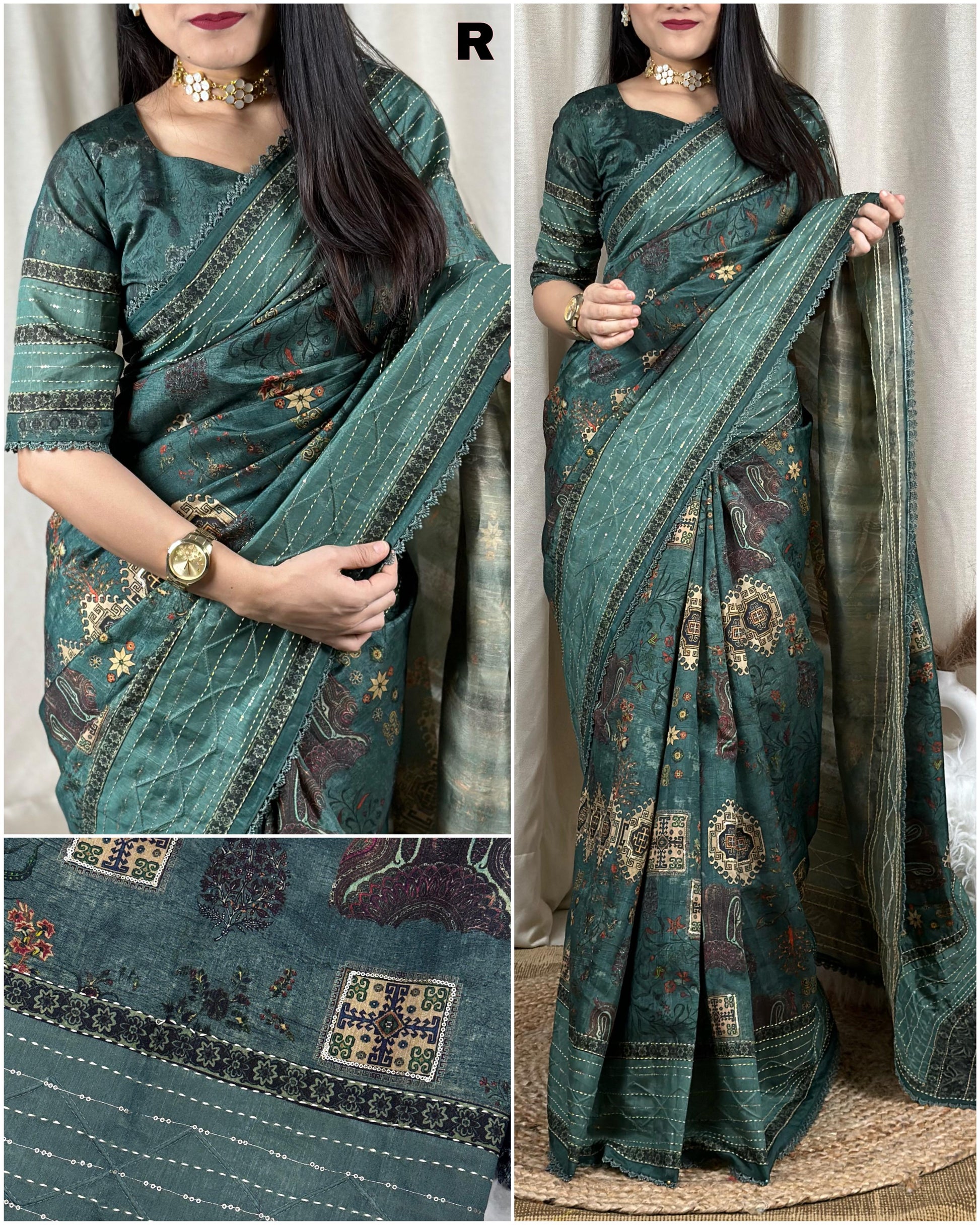 Blouse-printed with kantha work.