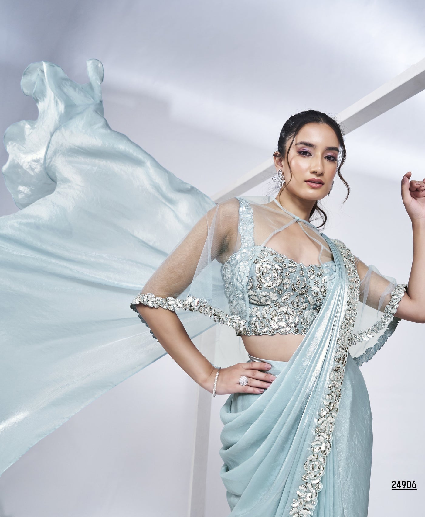 Sky Blue Two Tone Satin Silk Designer Ready to wear saree