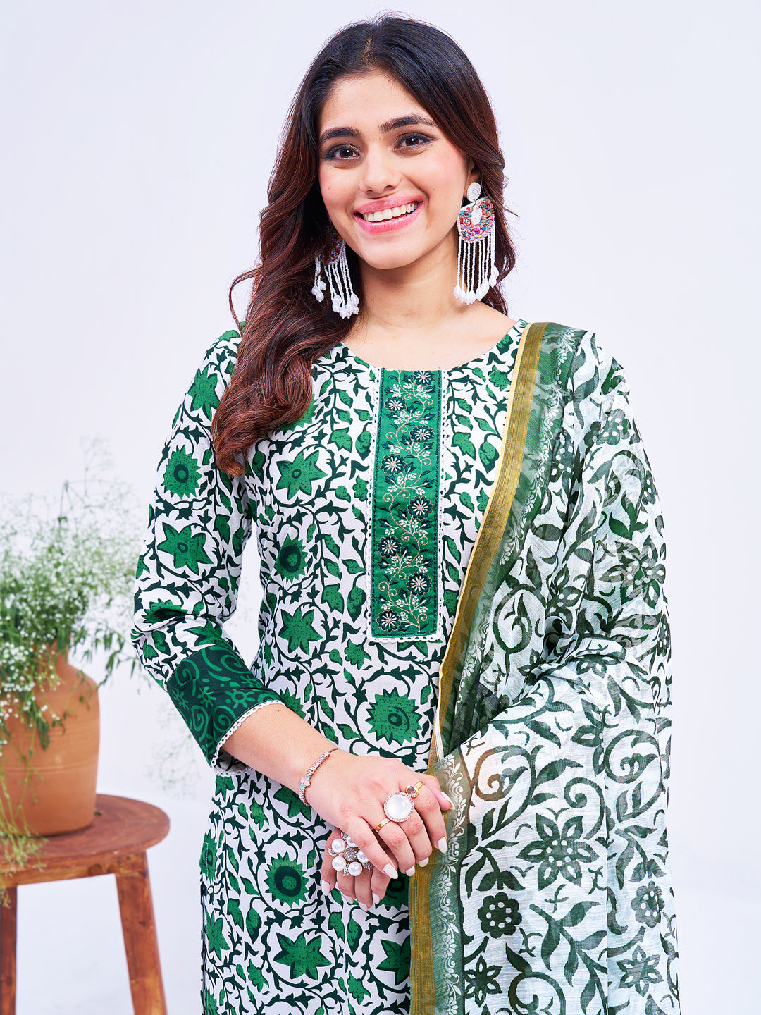 Green Rayon Print with Embroidery & Fancy Lace Work Kurti Set