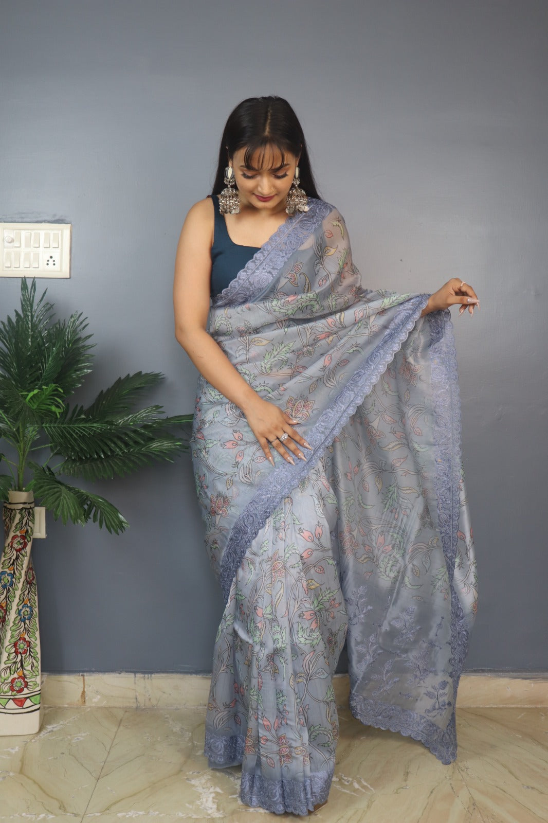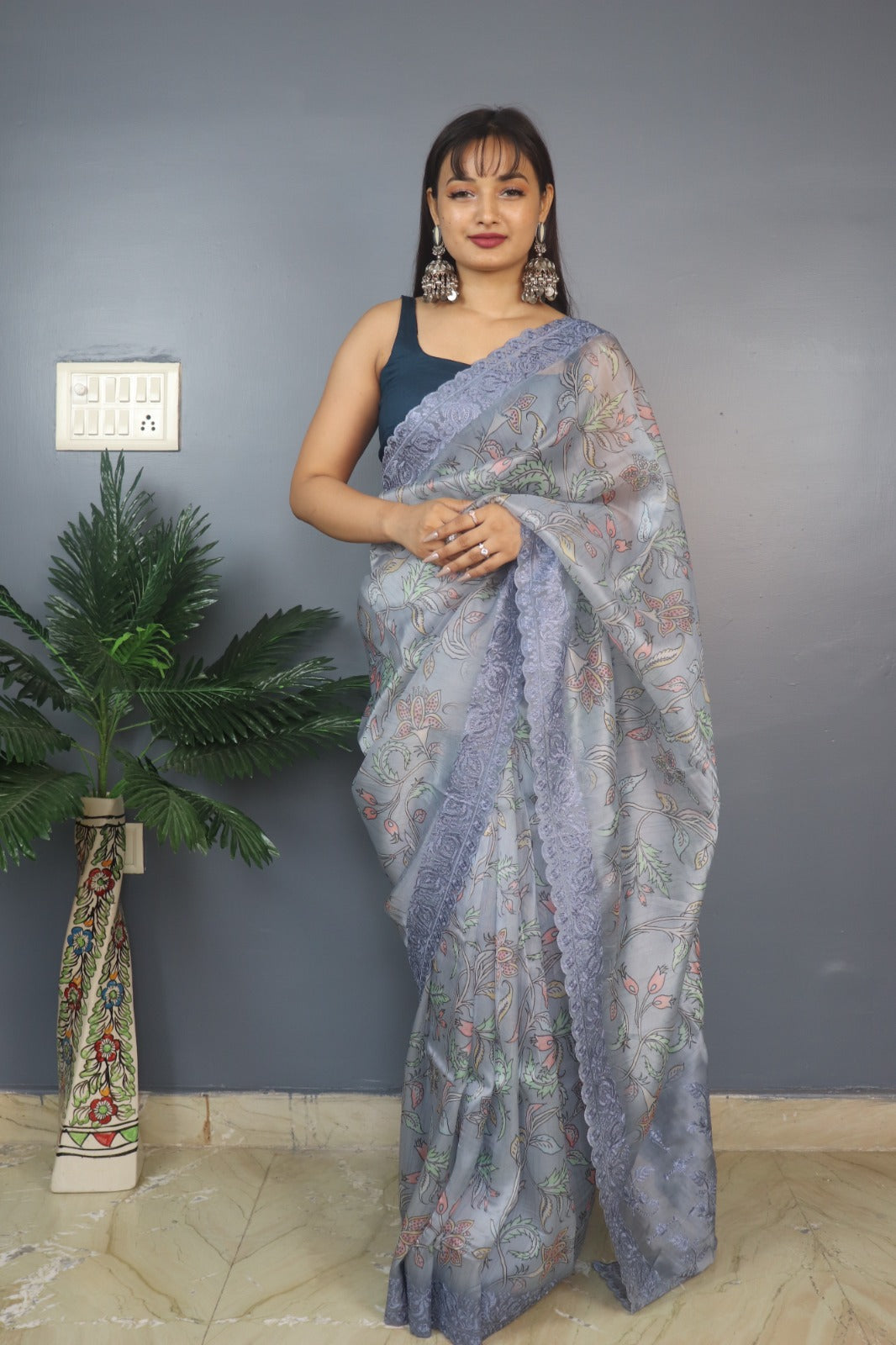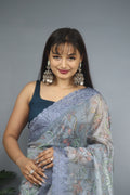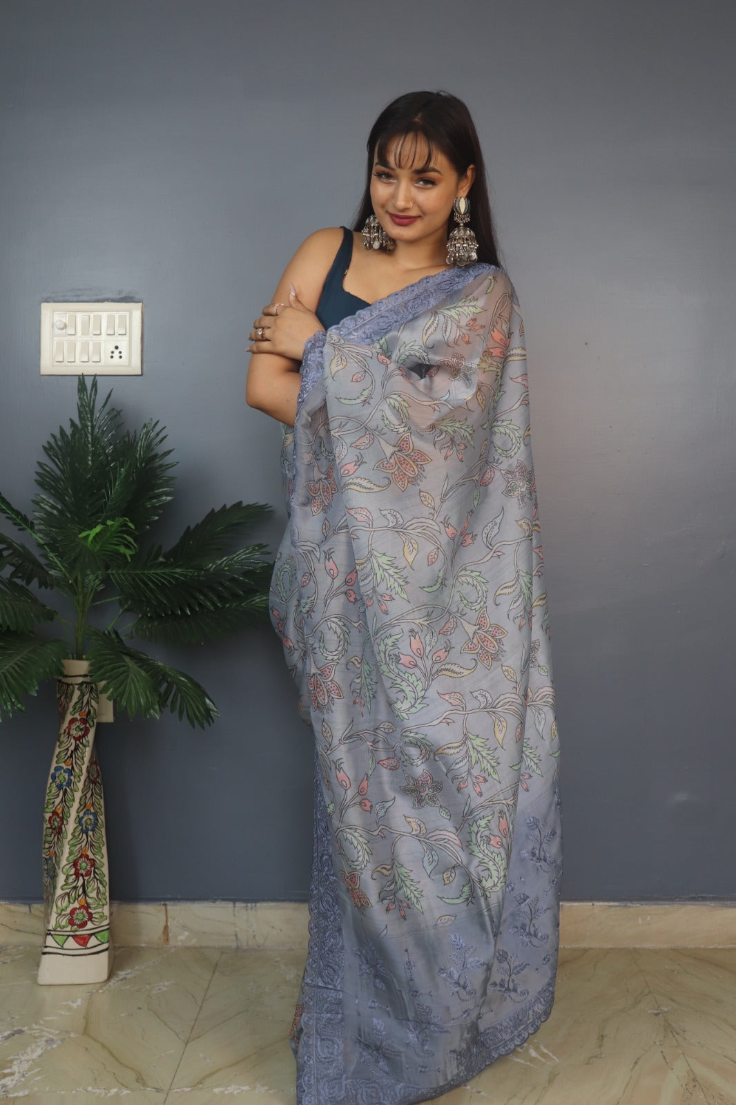 Pure soft organza silk saree with all over beautiful kalamkari prints and beautiful embroided pallu with elegant border all over saree with work blouse