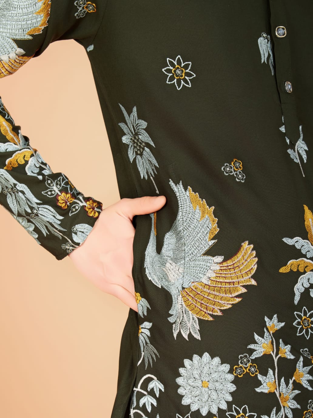 Olive Colour Soft Viscose Reyon Silk Heritage Style With Heavy Thread Work With Sequines Work Kurta Payjama