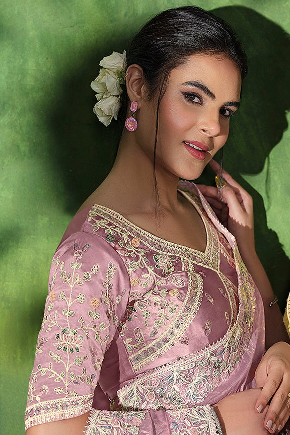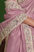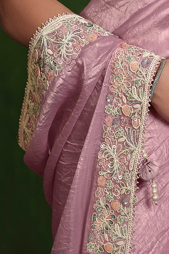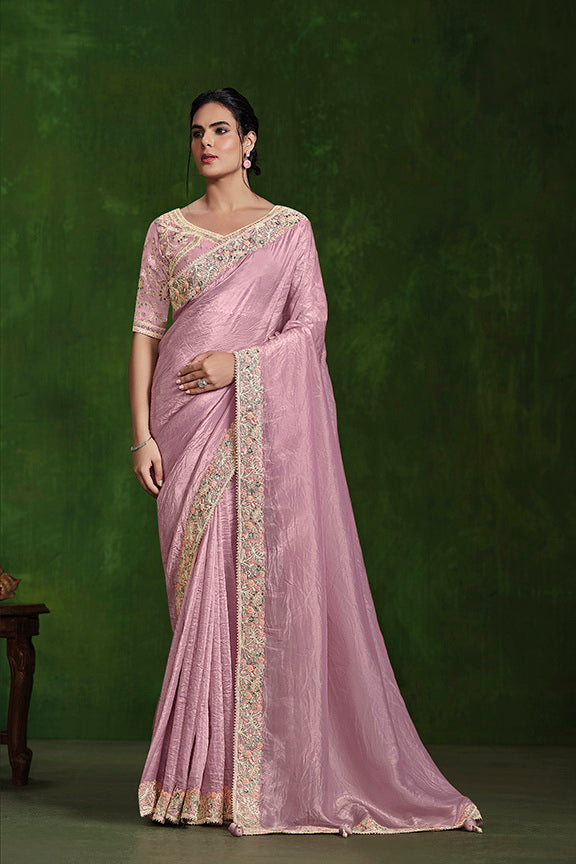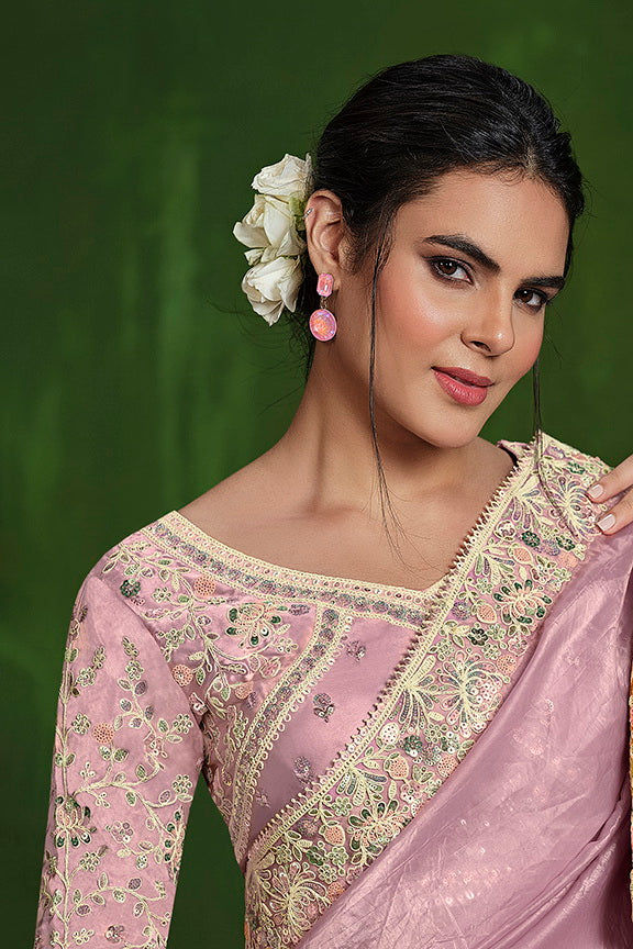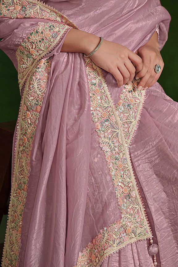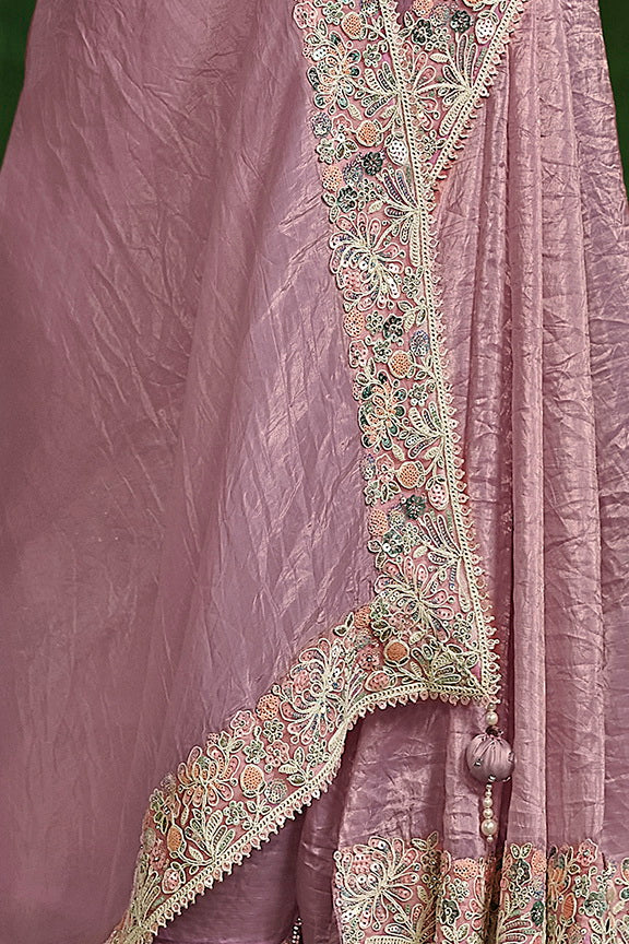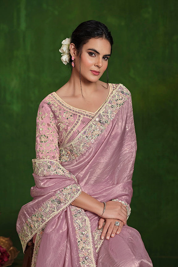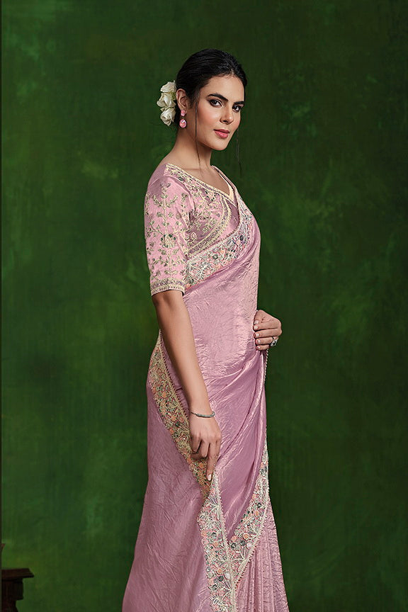 Dusty Pink Crush Paper Silk Dual Sequence with Handwork Saree with Stitched Blouse