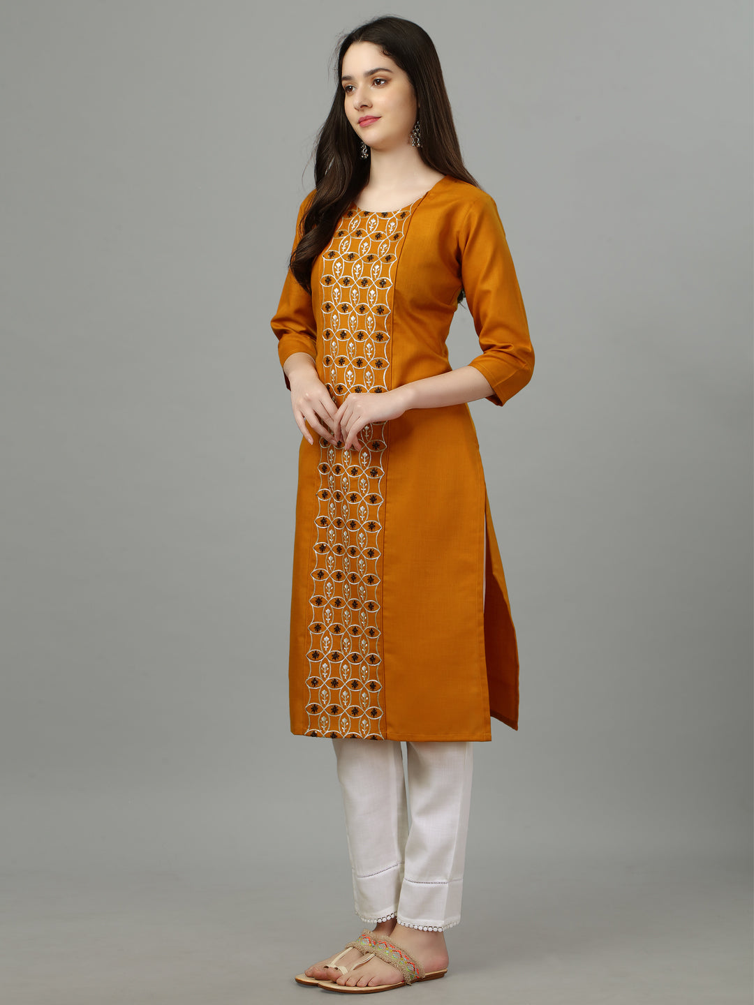 Mustard Heavy Cotton Magic Slub With Casual Embroidery Kurti