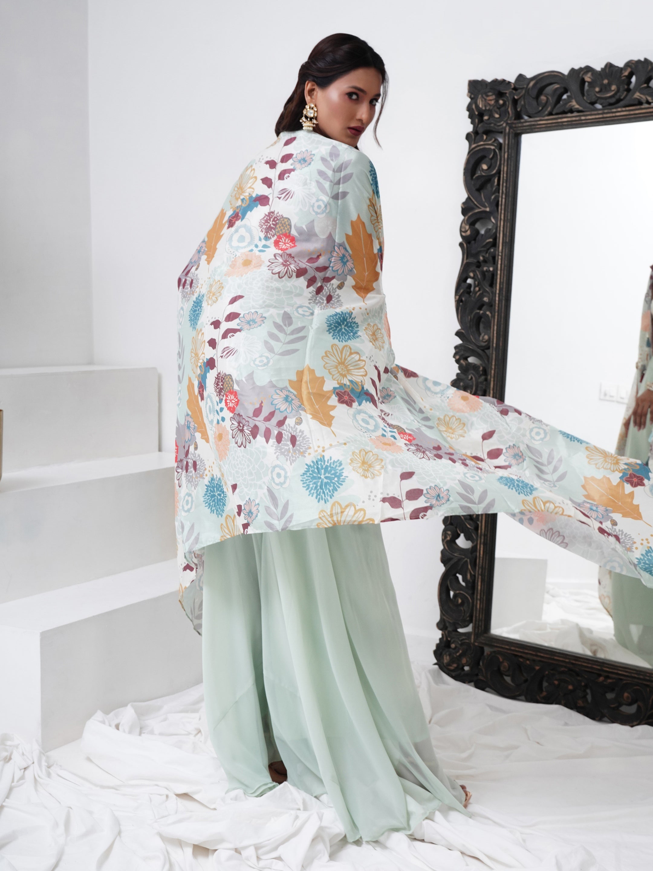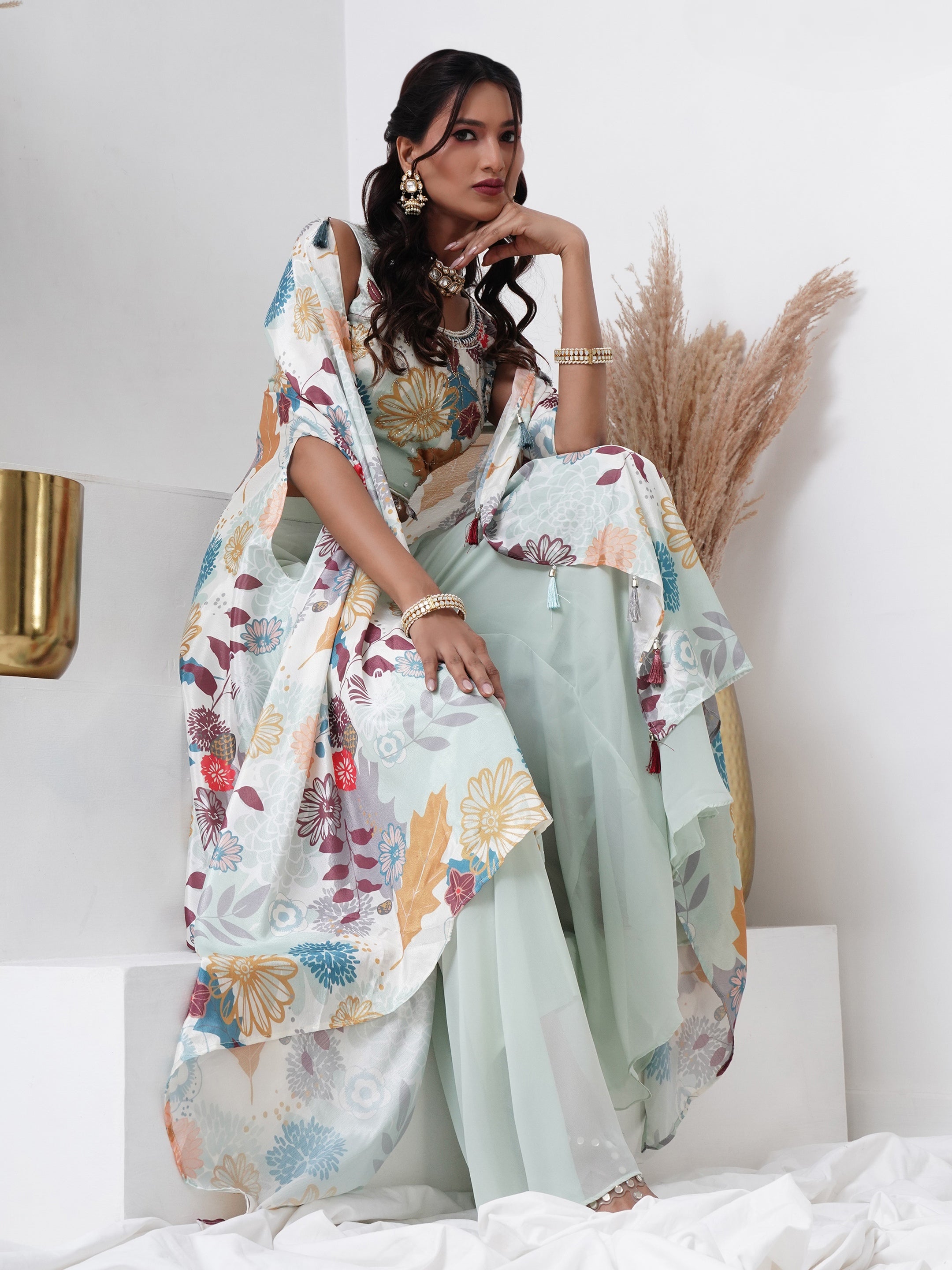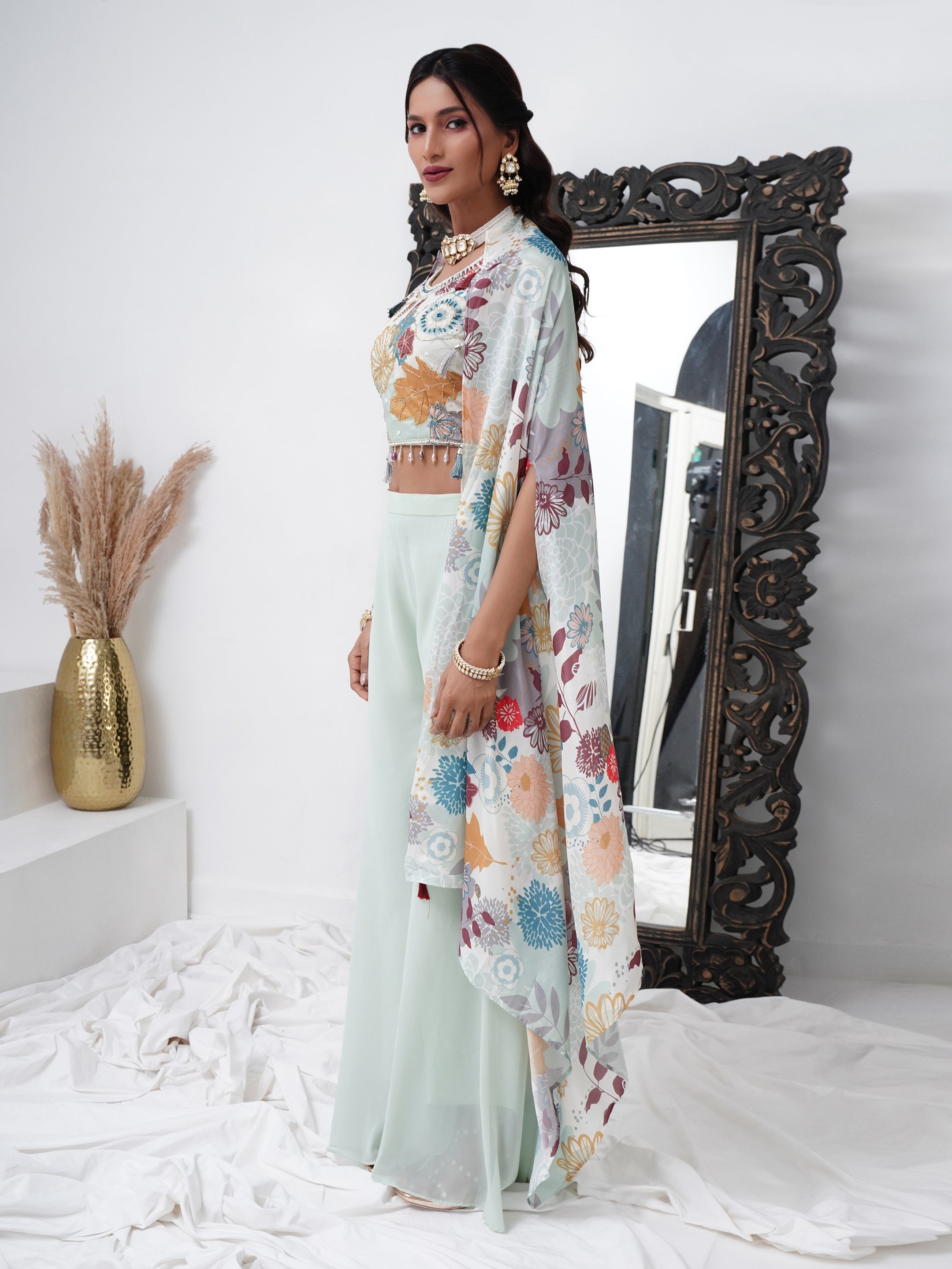 Pista Green Ready-to-Wear Chinon Crop Top With Floral Printed & Embroidered Suit