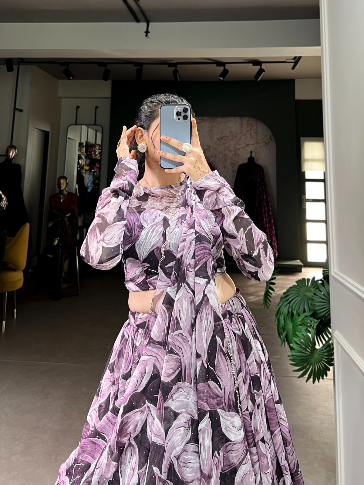 Coffee Colour Party Wear Pure Tabby Silk Printed With Hotfix Lehenga Choli