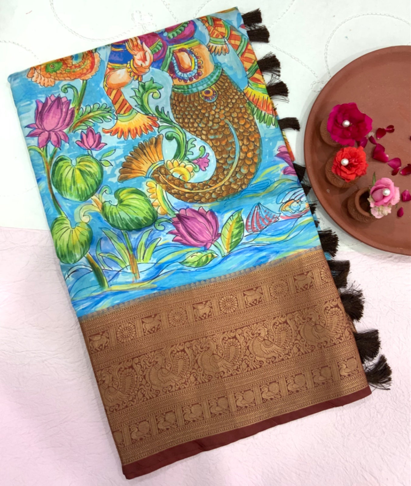 • Party Wear Saree MunMun Soft Banarasi Silk Kalamkari Saree