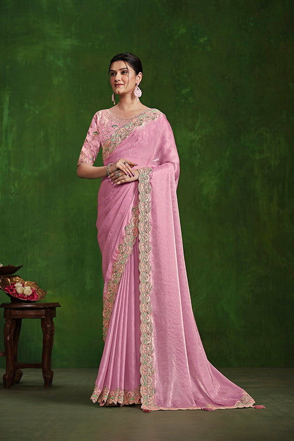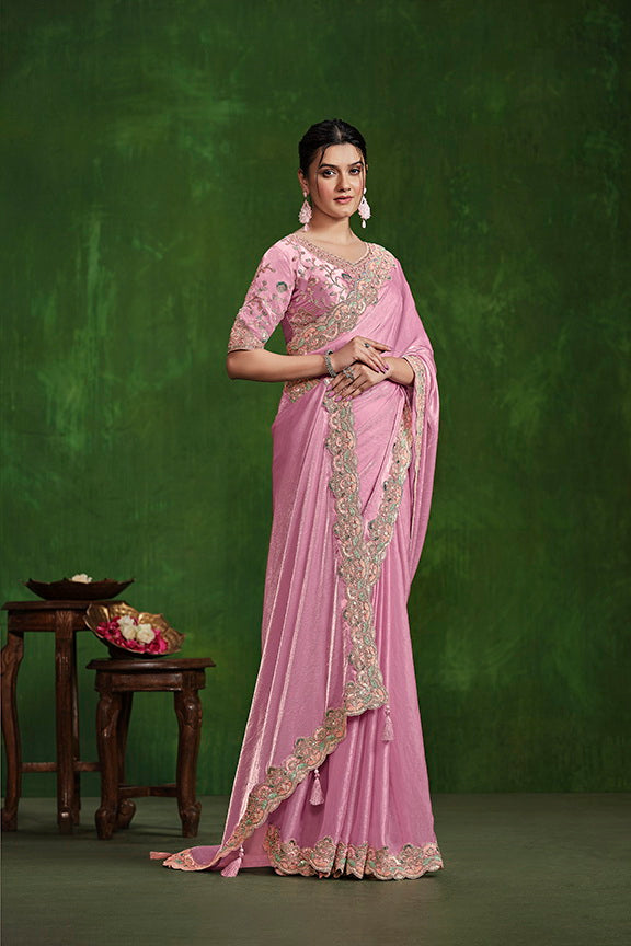 Pink Tone Satin Silk Dual Sequence with Diamond work Saree with Stitched Blouse
