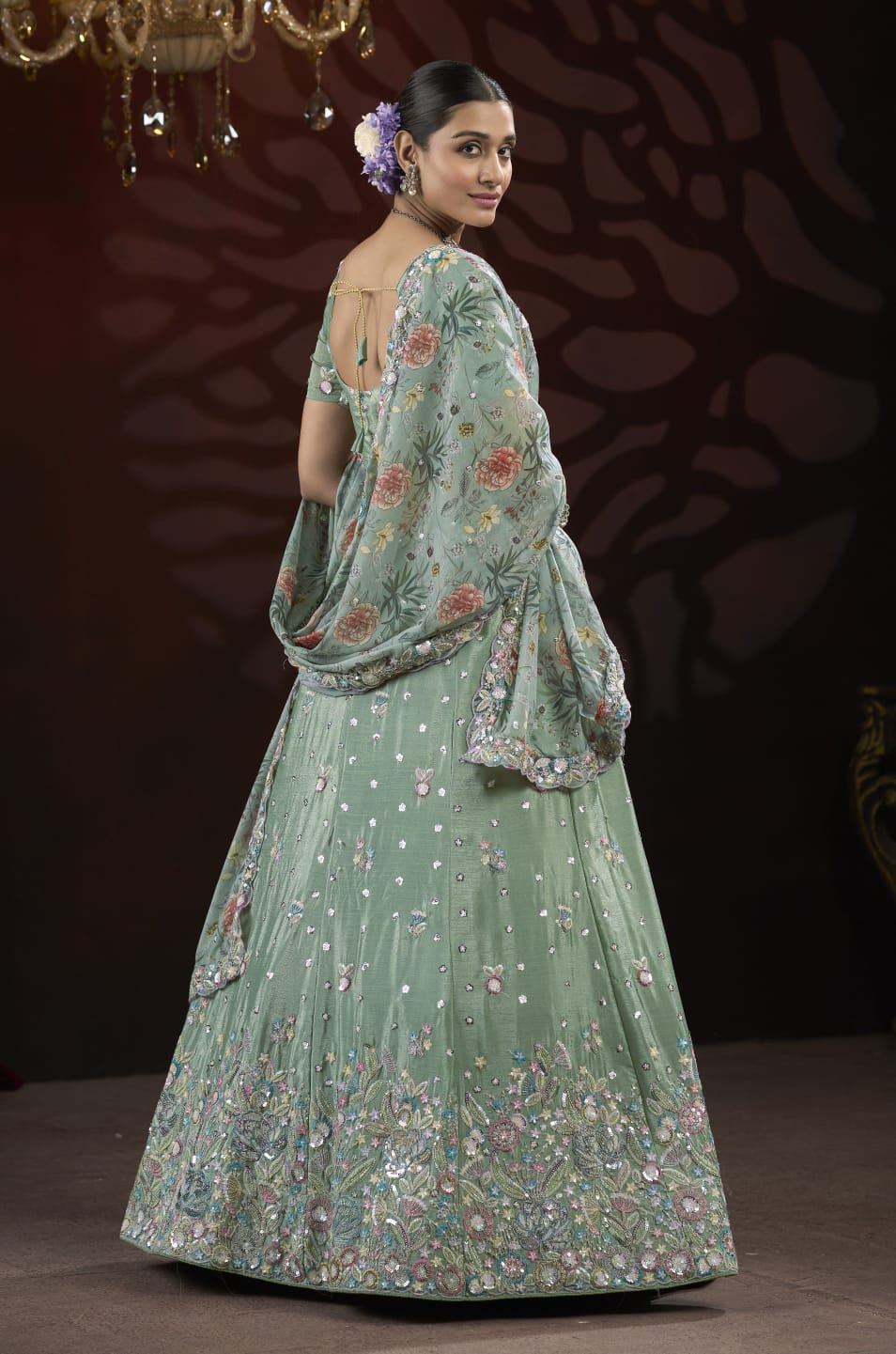 Pista Colour Multi Thread Work with Heavy Zari Sequins Embroidery Partywear Designer Lehenga Choli