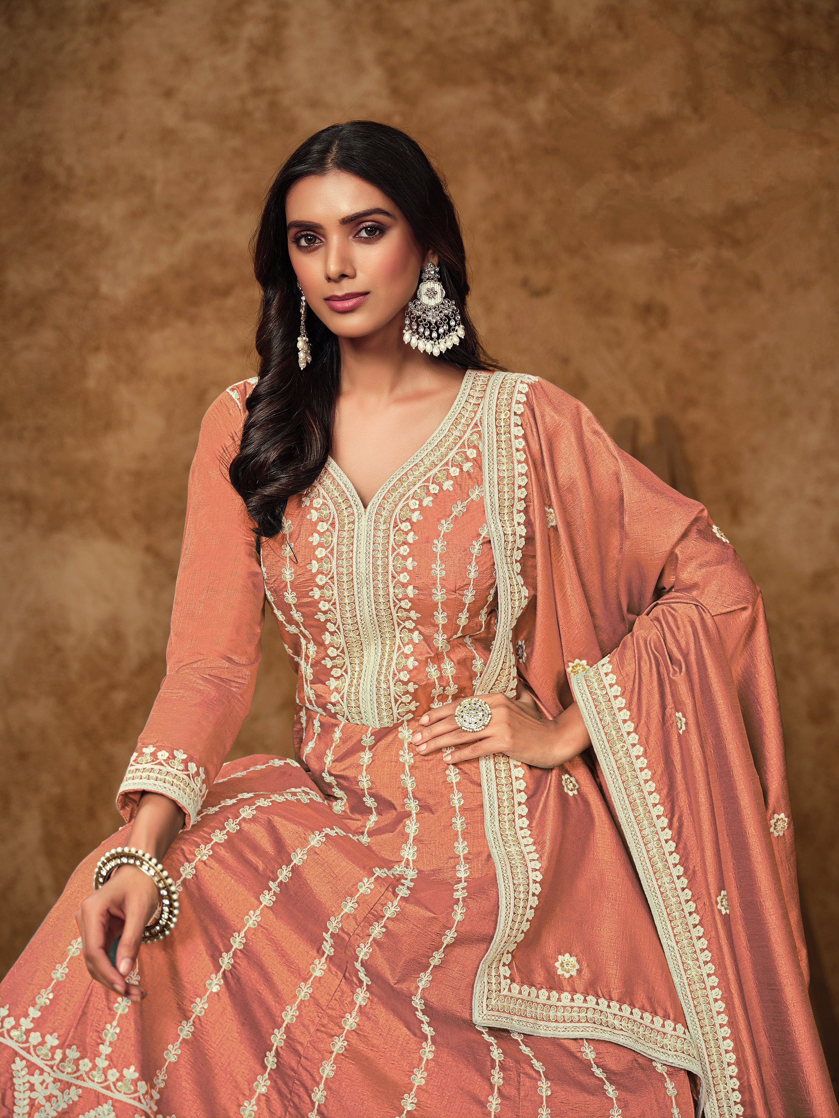 Peach Colour Pure Soft Dolla Silk Long Floor Length Embroidered Work Readymade Gown