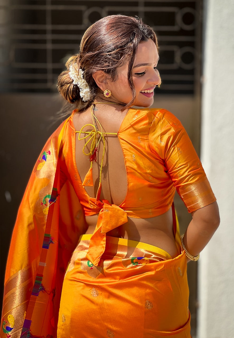 Paithani Sarees with zari motifs all Over the body having Rich woven Lotus Paithani Meenakari Pallu and unique Peacock Meenakari Paithani Border Paired with Brocade Blouse same as shown.