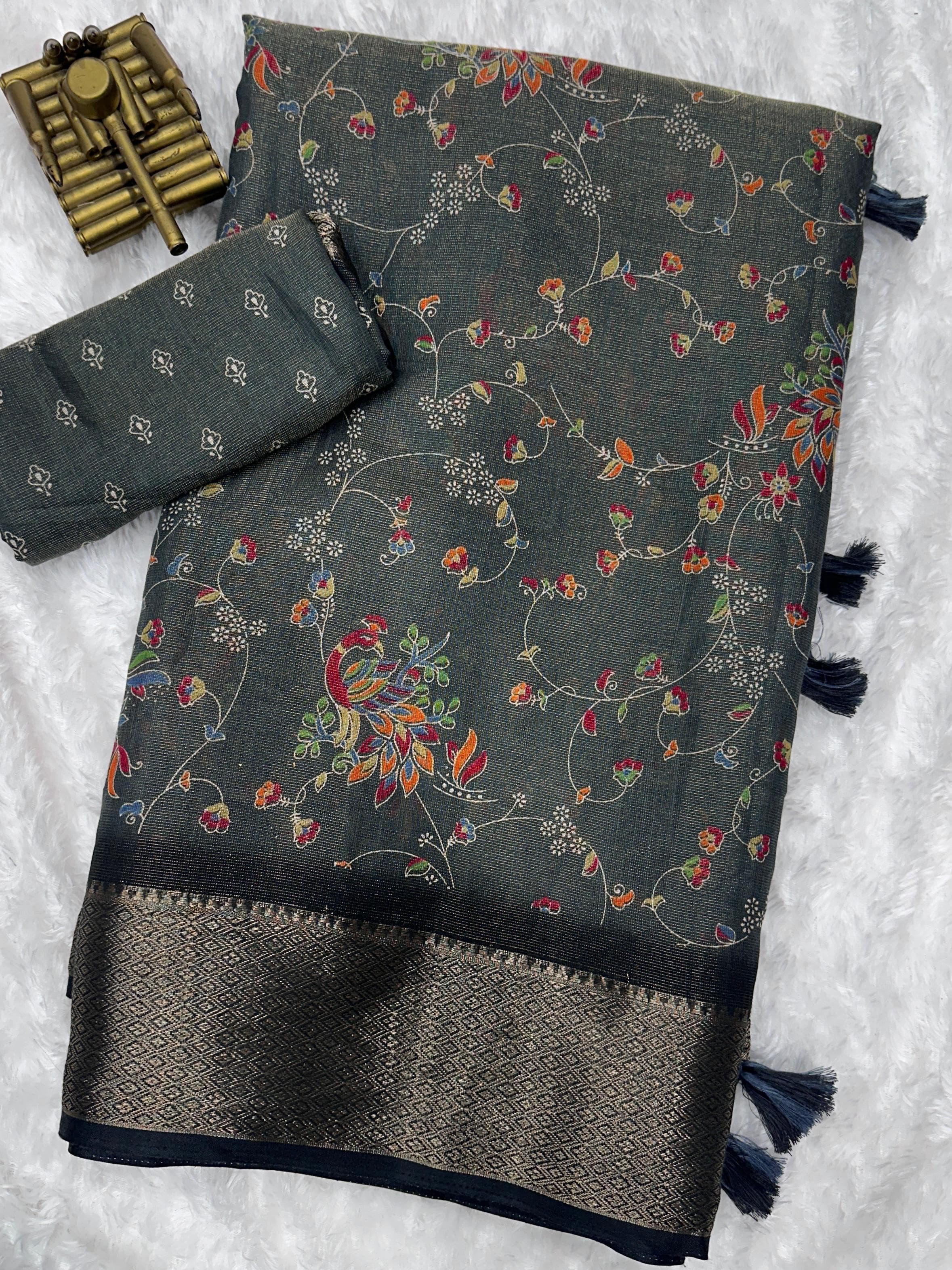 Pattern-Designer padding printed saree with zari weaving in full saree and zari boder & tussles in pallu