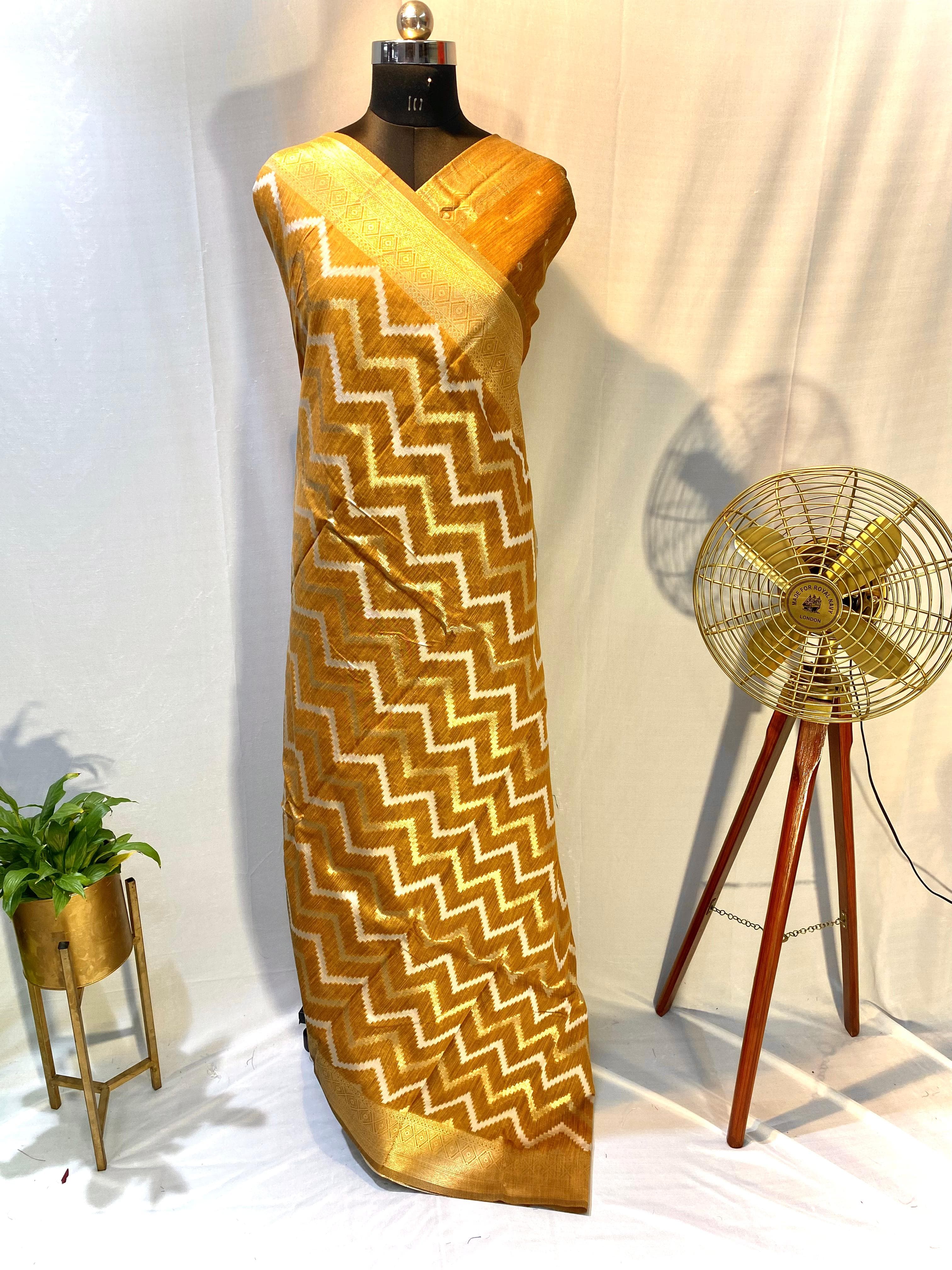 Pure Linen Cotton Saree With Copper And Gold Zari Weaving Zigzag Pattern All Over Saree with Rich Weaved Pallu And Brocade Blouse Piece Shown As Per Videos