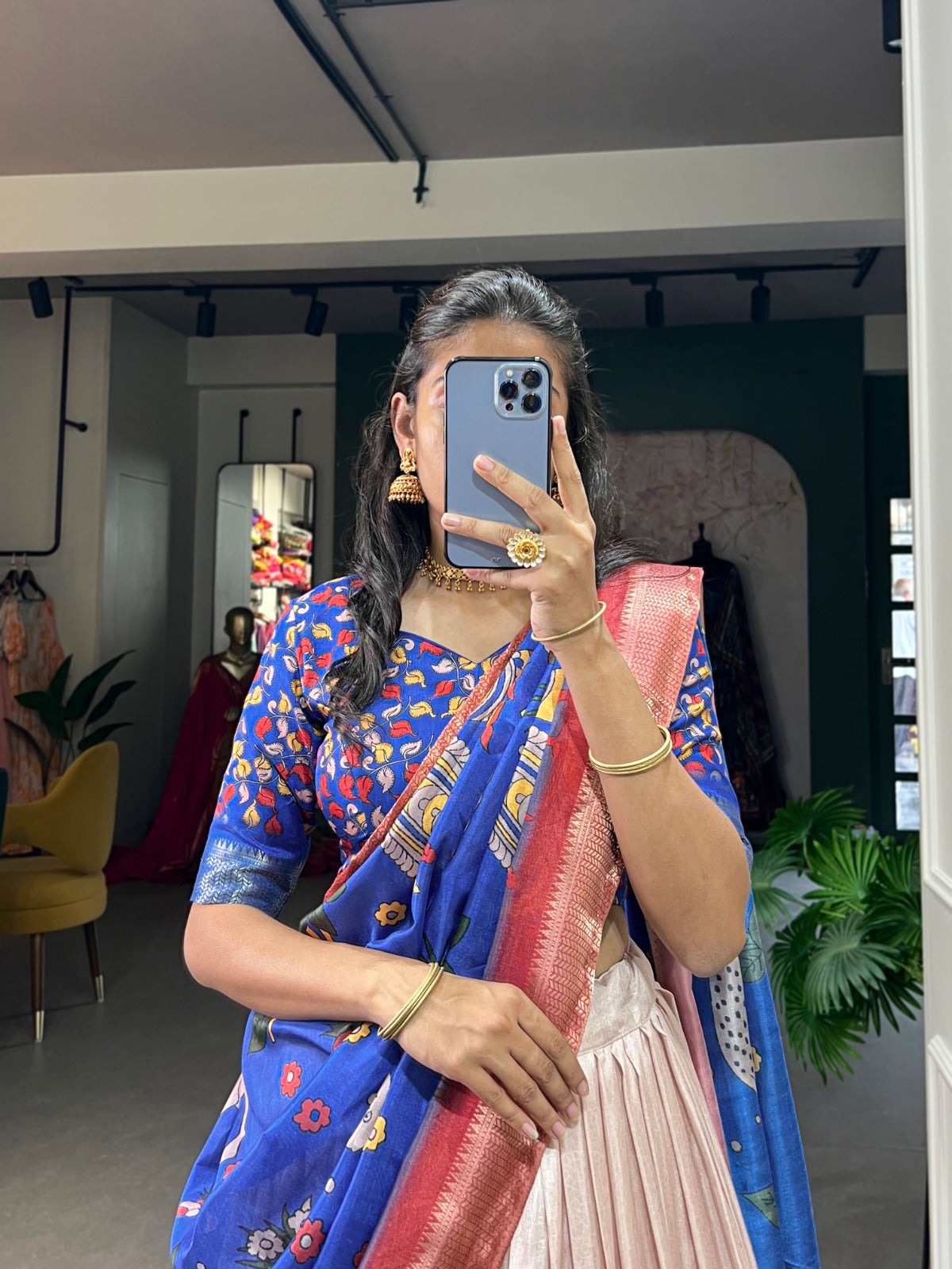 The perfect fusion of tradition and contemporary style, this Kalamkari Print Dola Silk Lehenga with a weaving border is a must-have for any fashion-forward individual