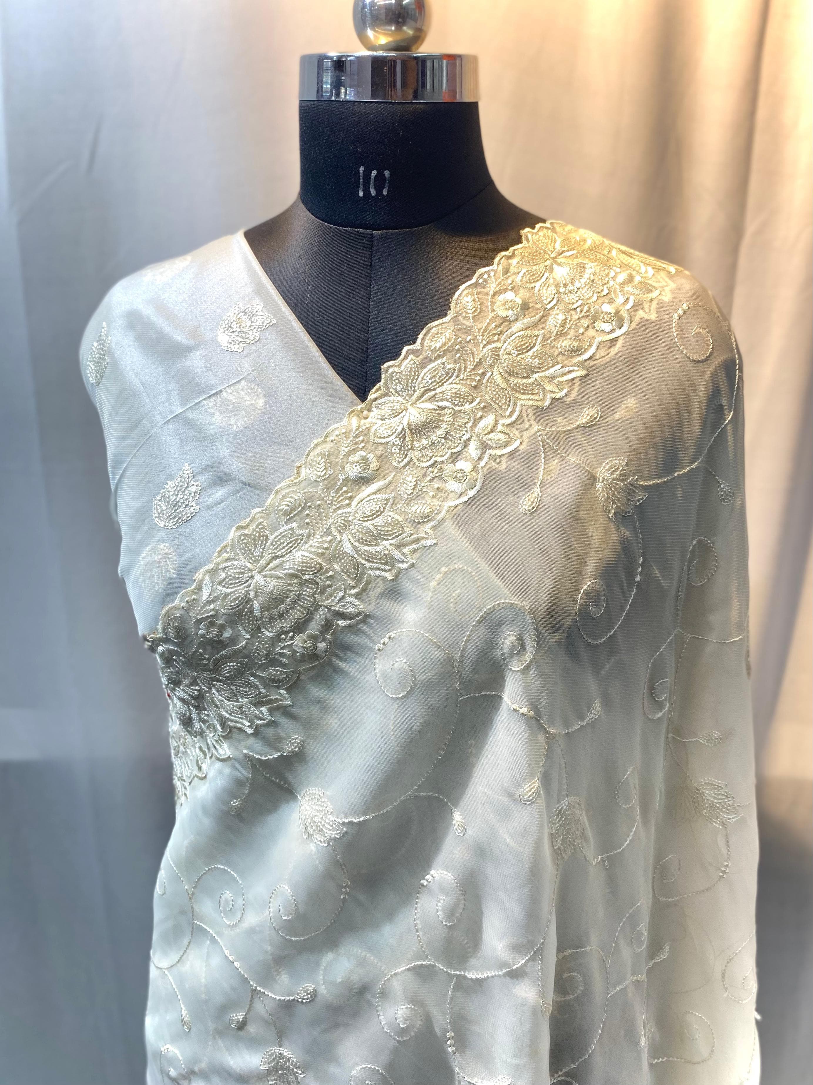 Description - Soft Organza Chex Weaves Silk Sarees With Super Fine Embroidered Pattern with Cutwork, Beautiful Sequins Work All over the Saree.