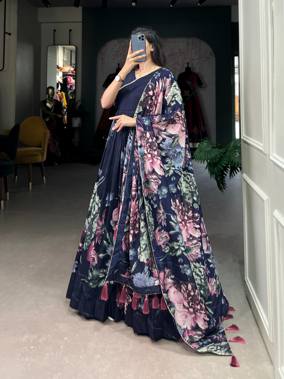 Women's Designer Party Wear Tussar Silk Printed Gown With Dupatta