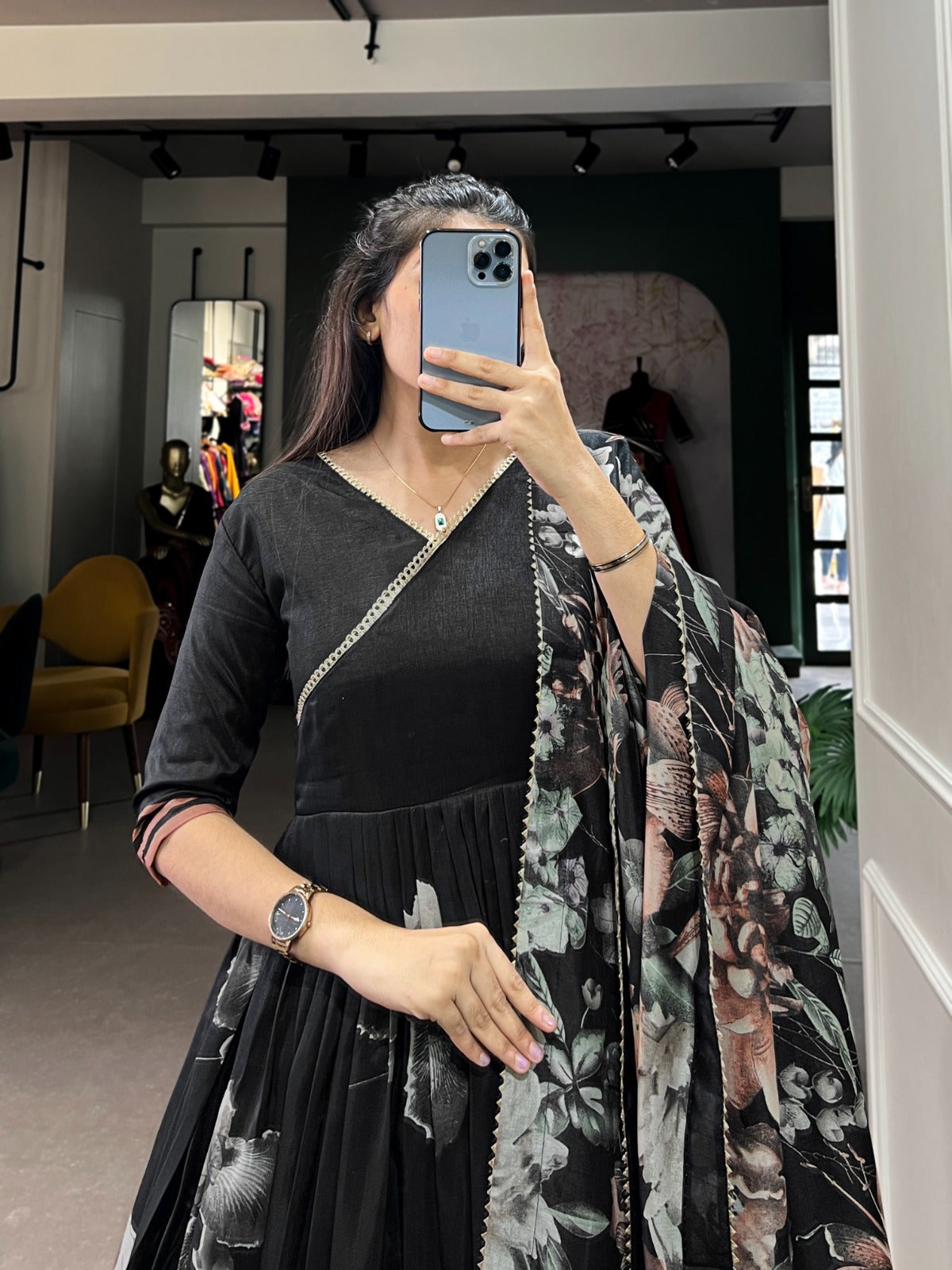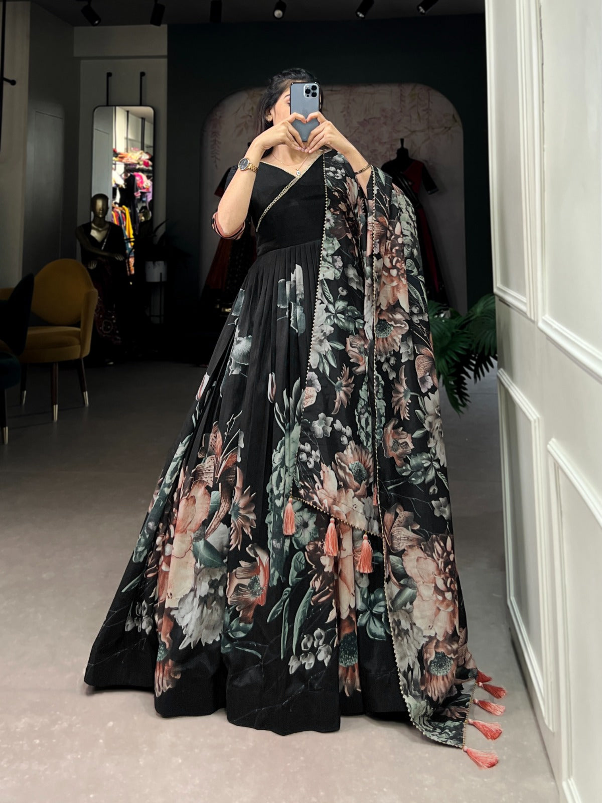 Women's Designer Party Wear Tussar Silk Printed Gown With Dupatta loading