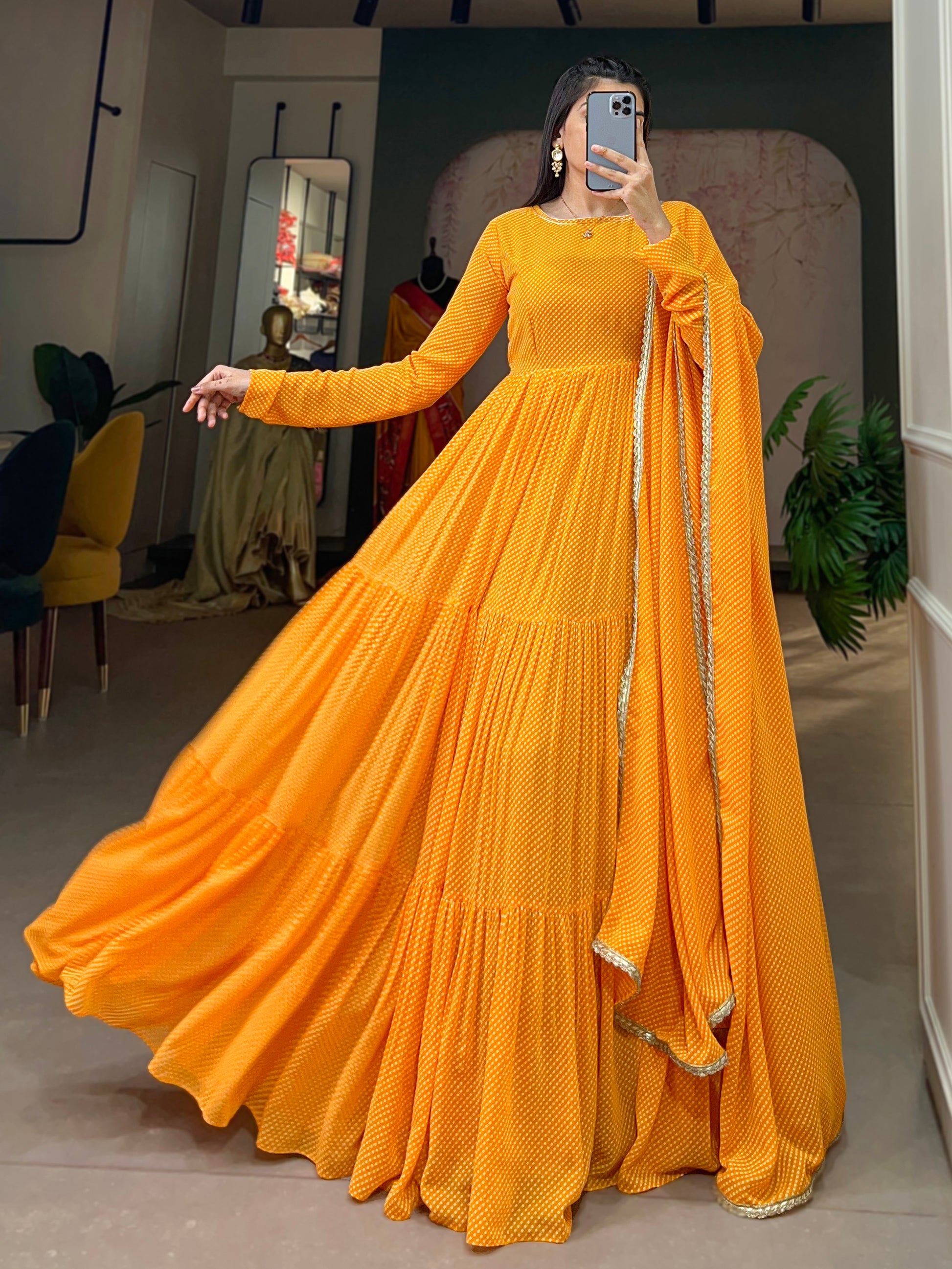 Women's Designer Yellow Printed Georgette Haldi Wear Gown With Dupatta
