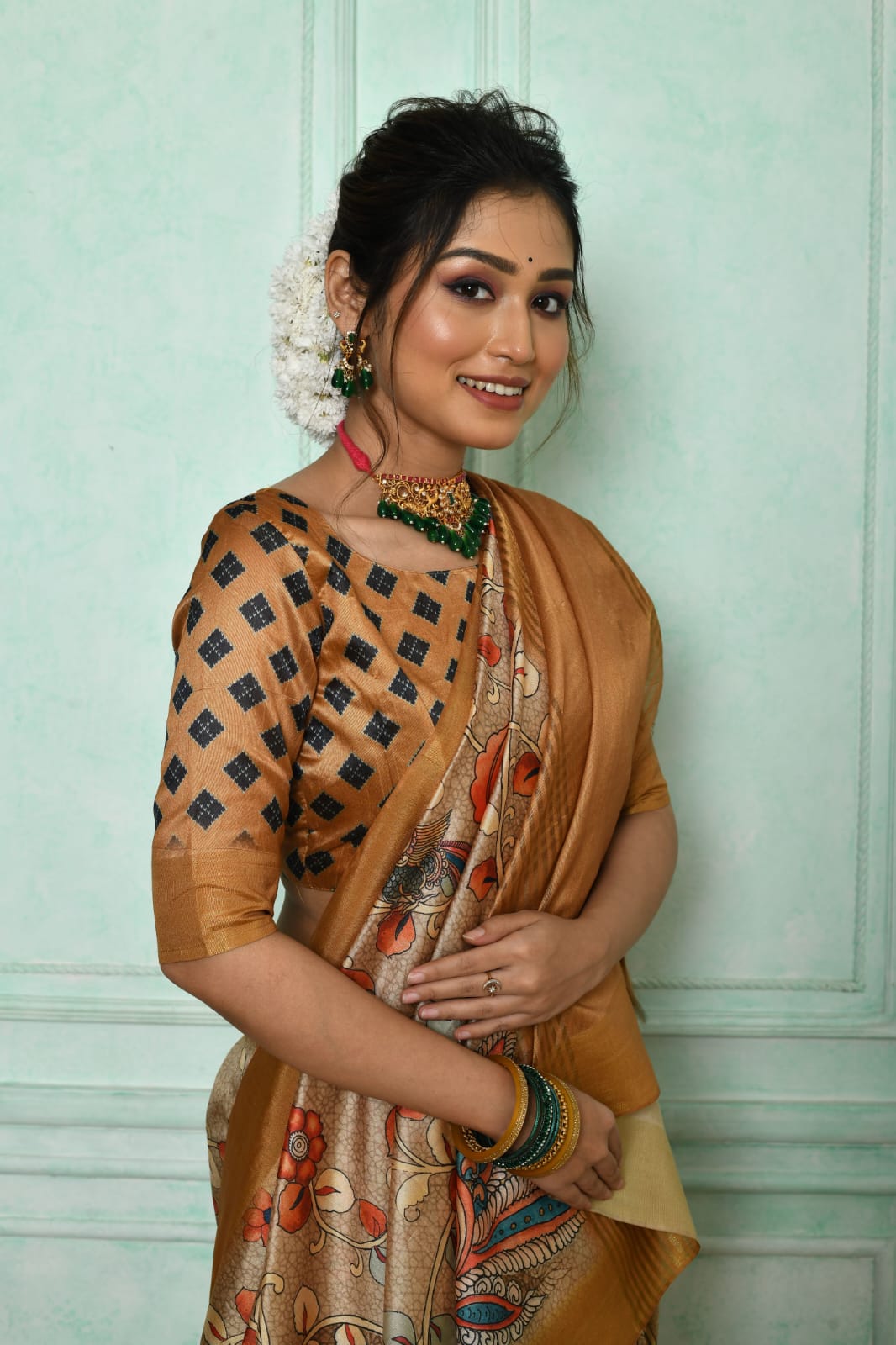 Premium and Superior Soft Ghicha Tussar Silk Saree with all Over Beautiful Kalamkari Print and Soft Zari Pallu With Contrast Blouse Piece and Tassels at Pallu