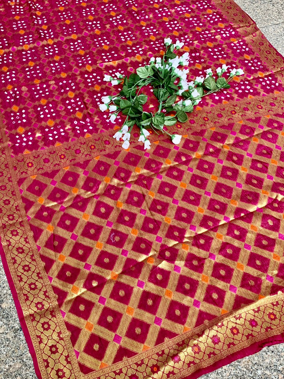 Pure Bandhej silk saree made by *Original Bandhej with Kanchipuram zari weaving big Border with Zari Weaving Rich Pallu  saree with beautiful design and having a big broad border.