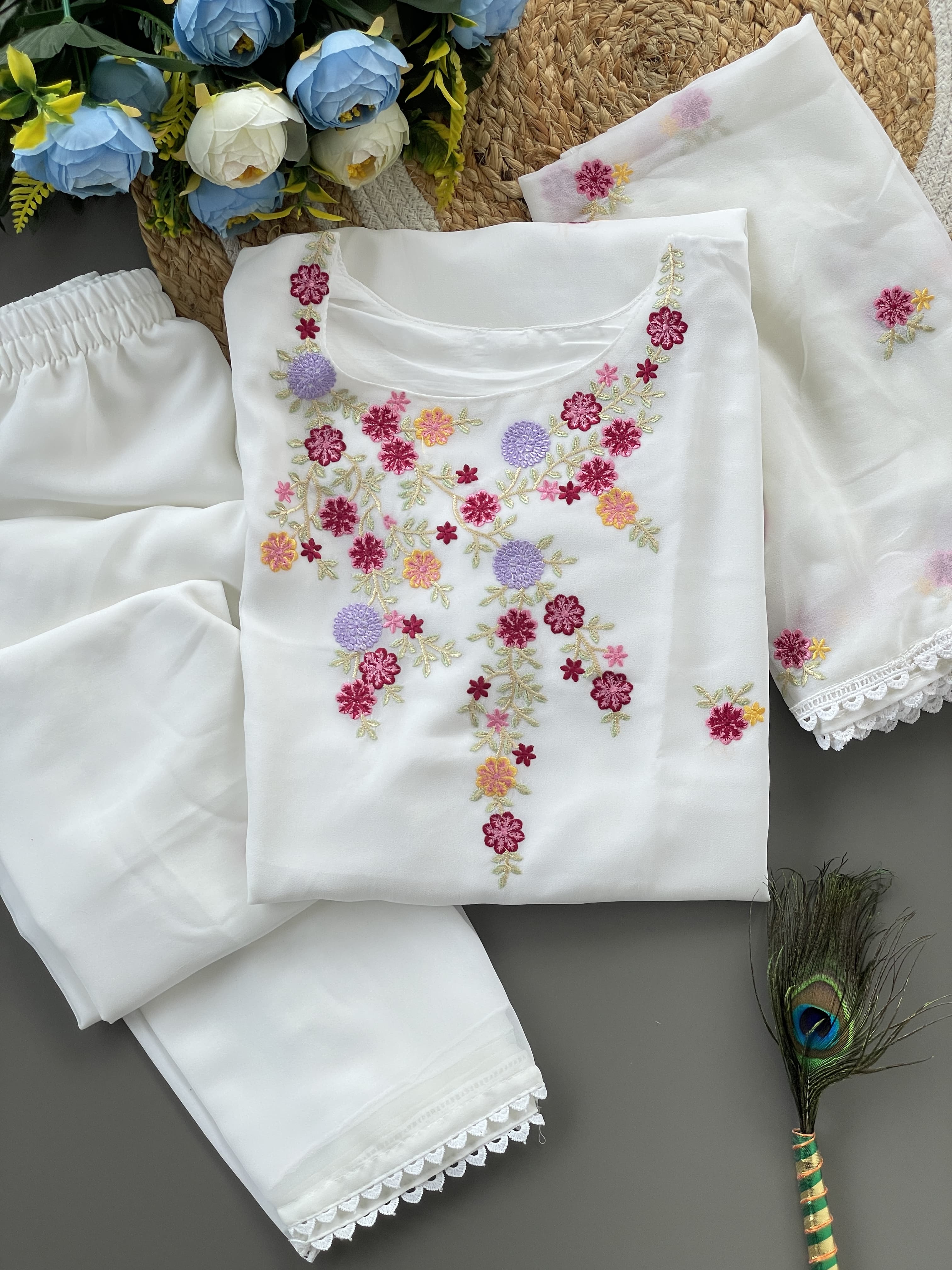 Women's Designer Pure Georgette Top With Bottom & Georgette Dupatta Kurti With Pent