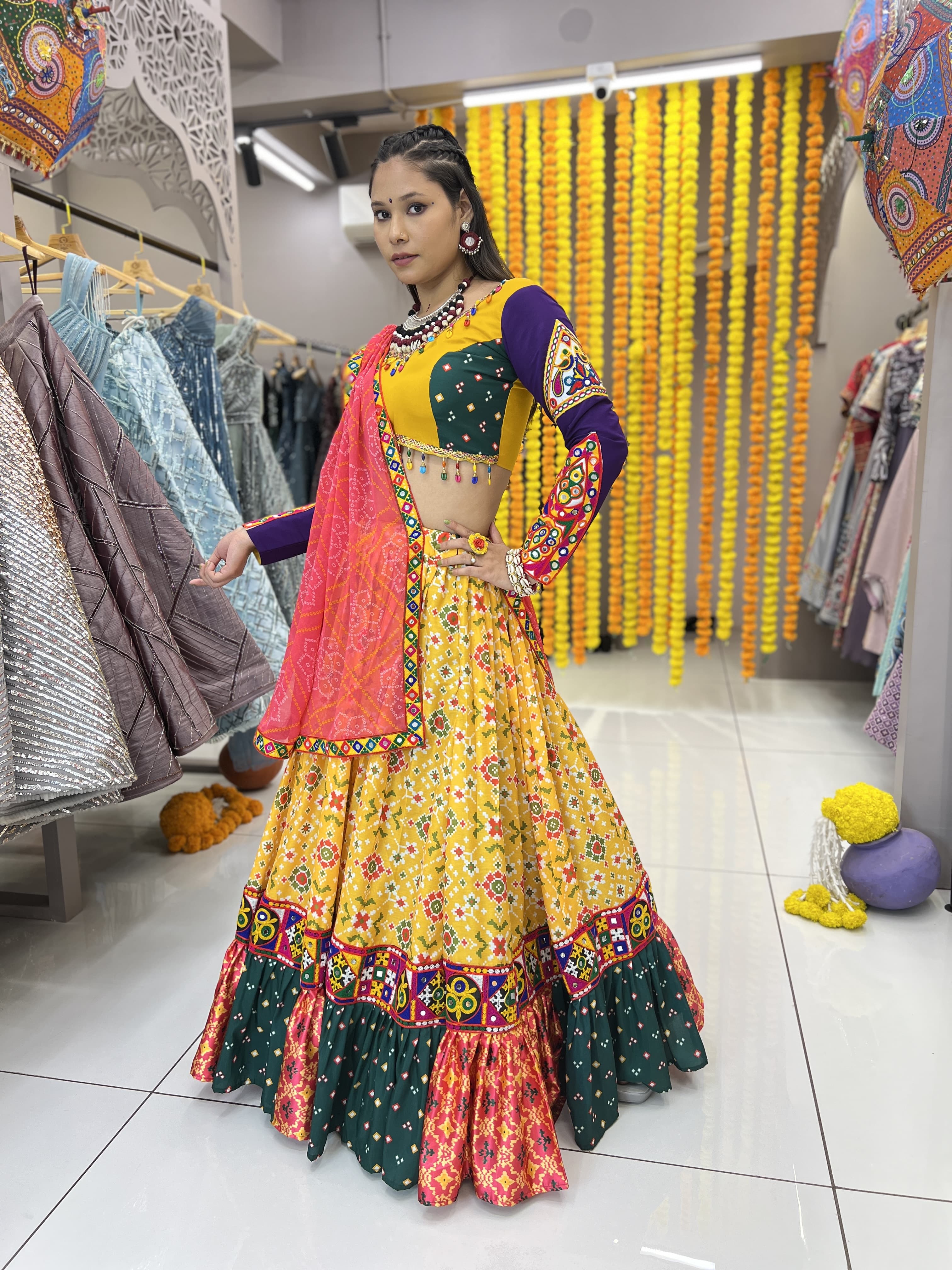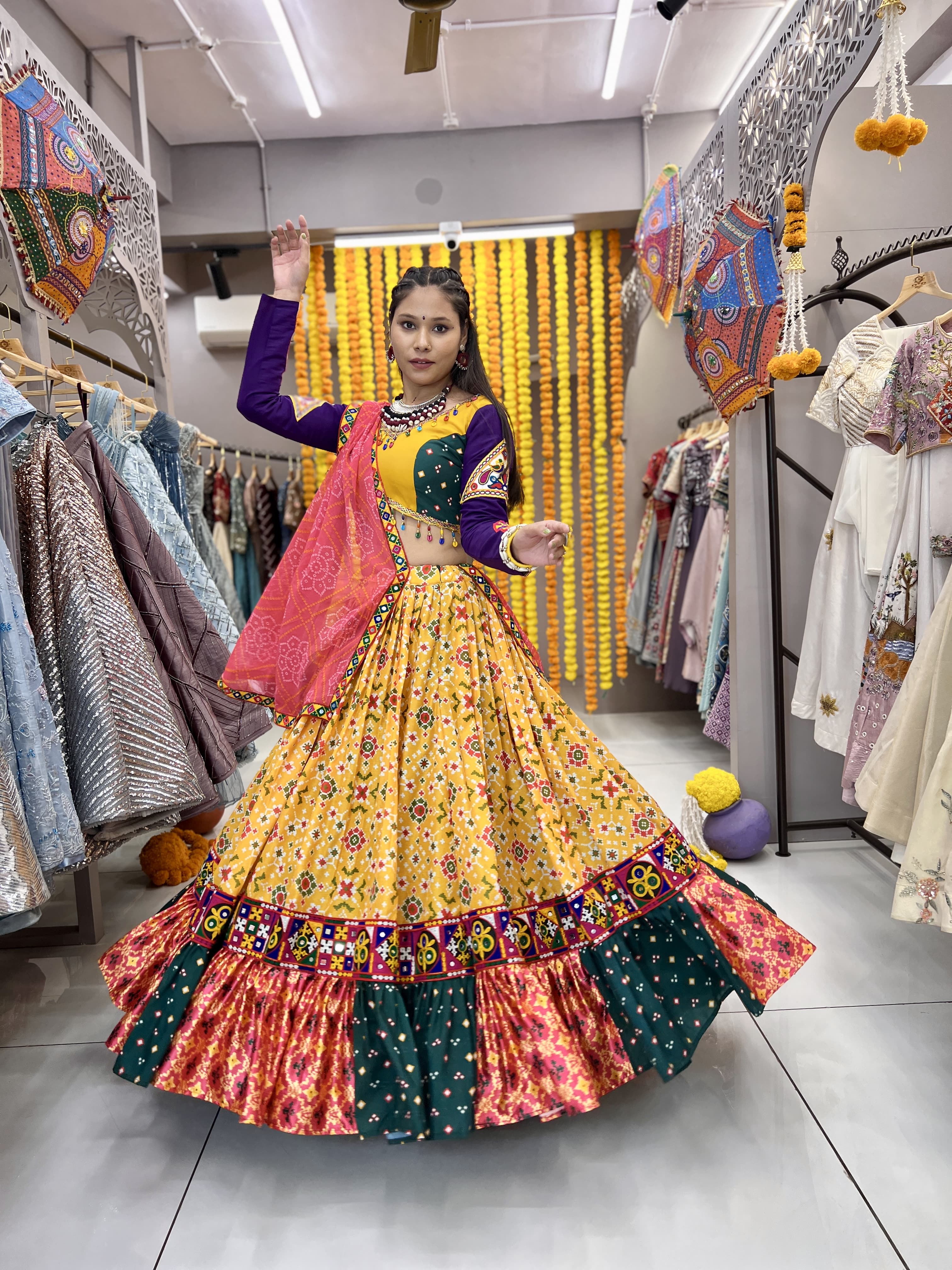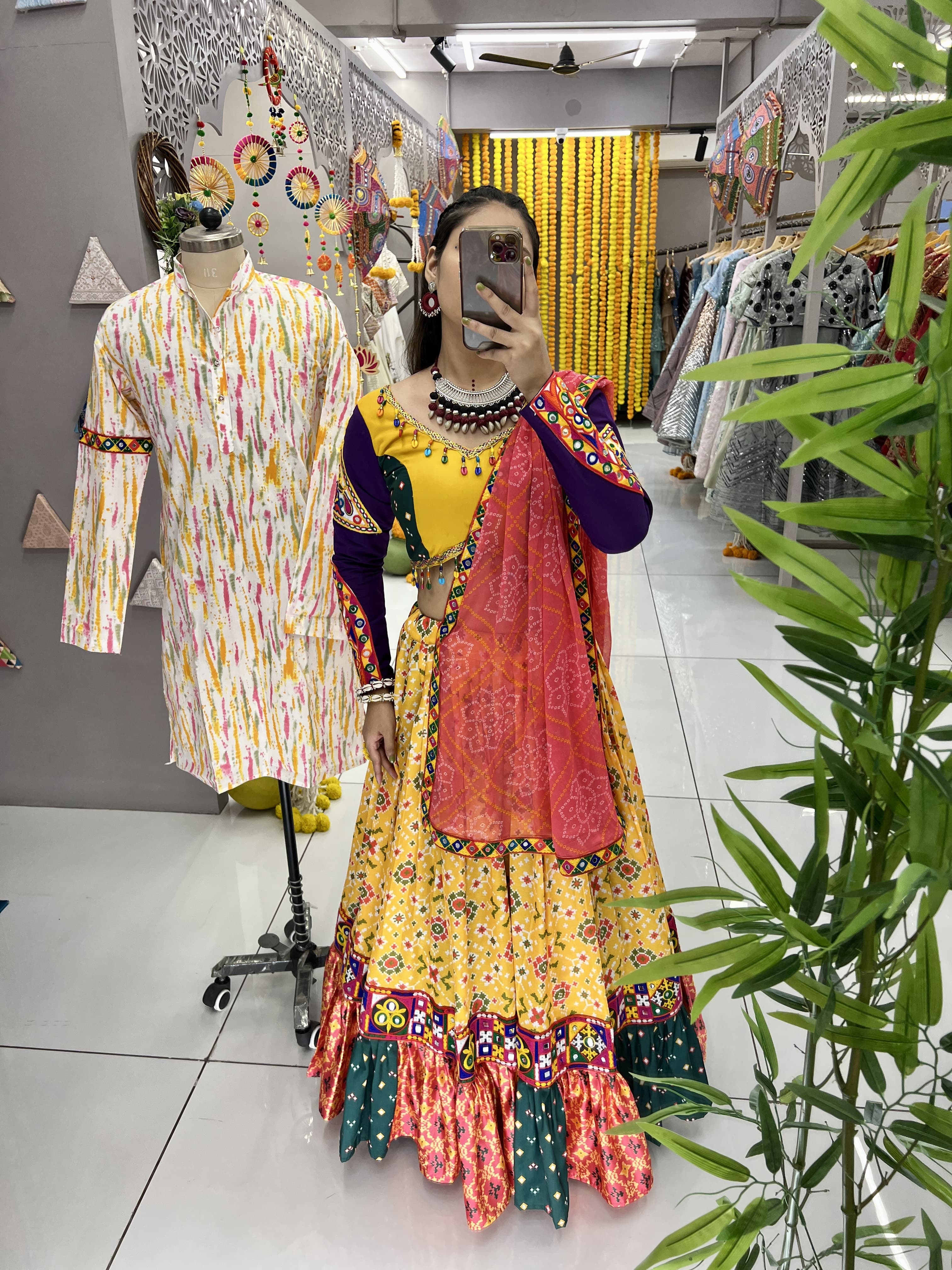 Traditional Style Yellow Color Maslin With Patola Print Premium Navratri Couple Wear Lehenga Choli