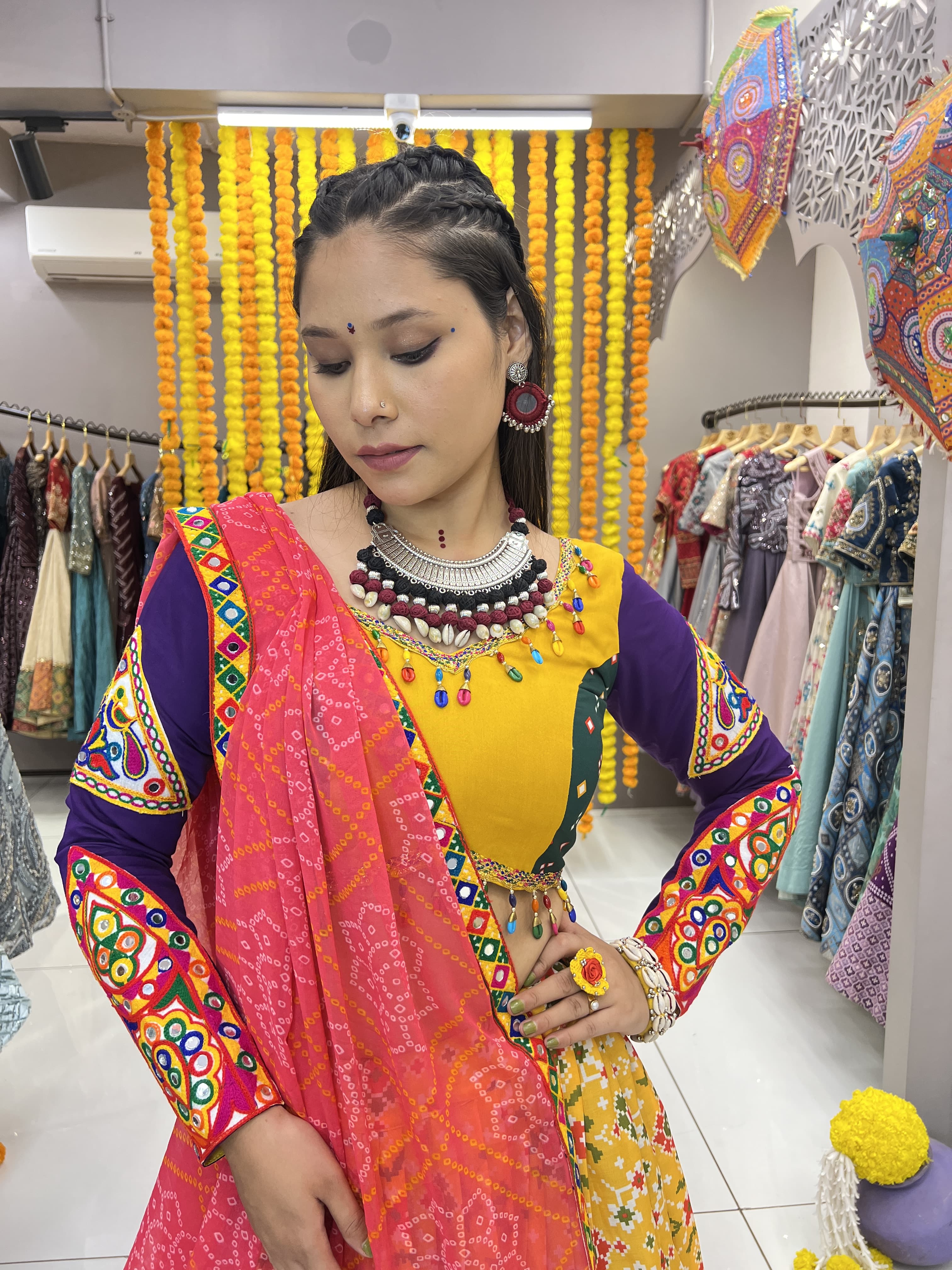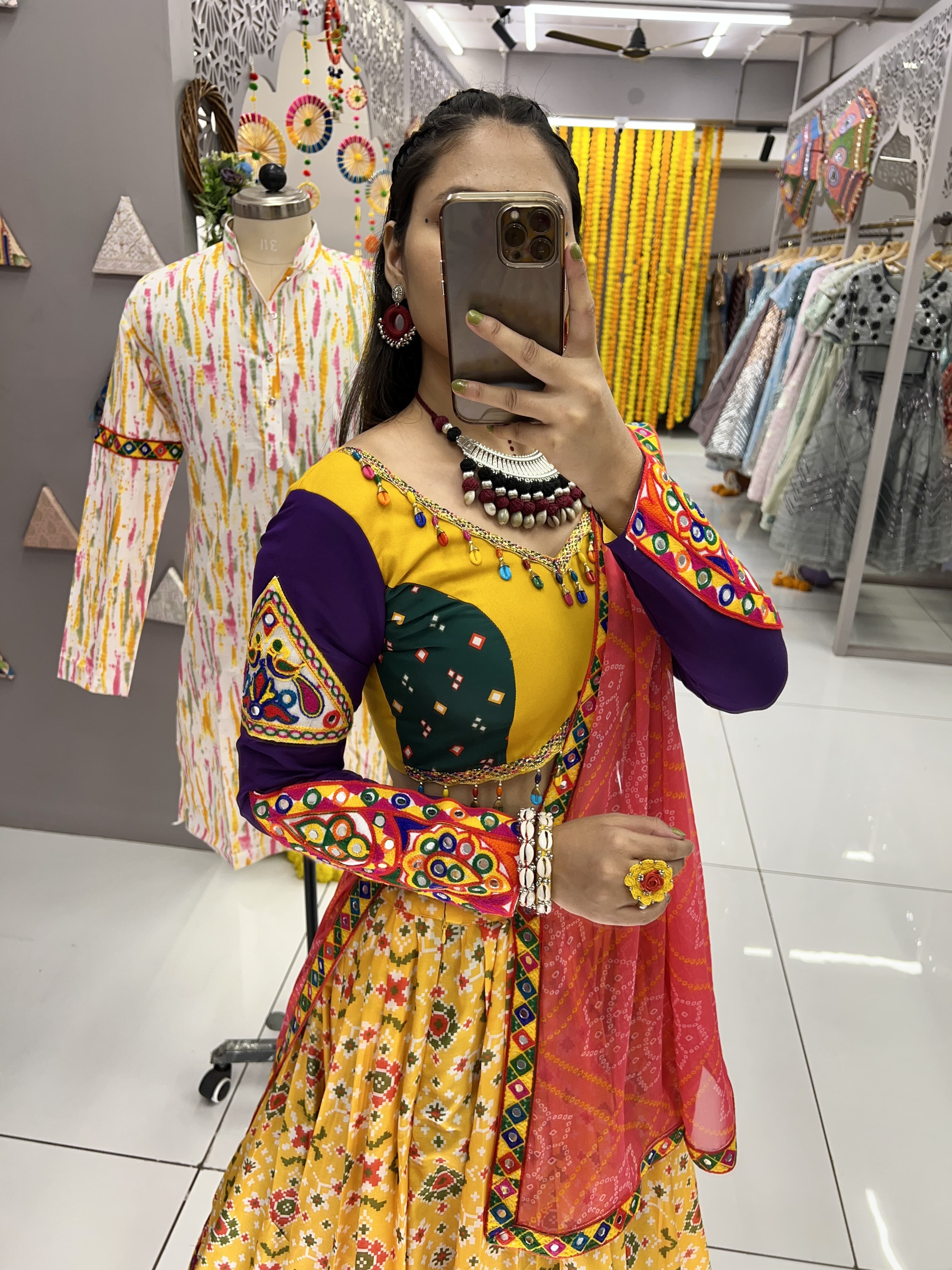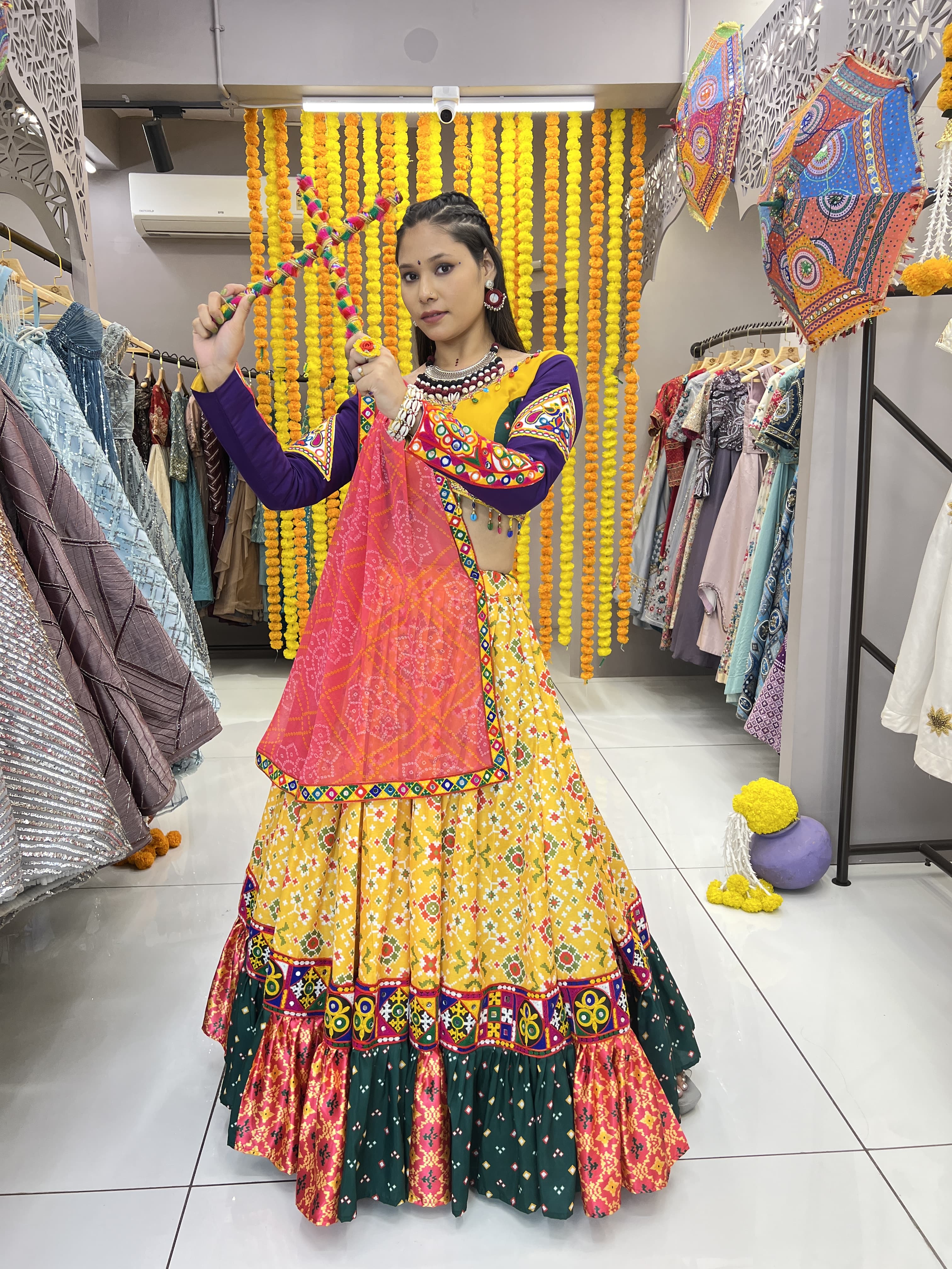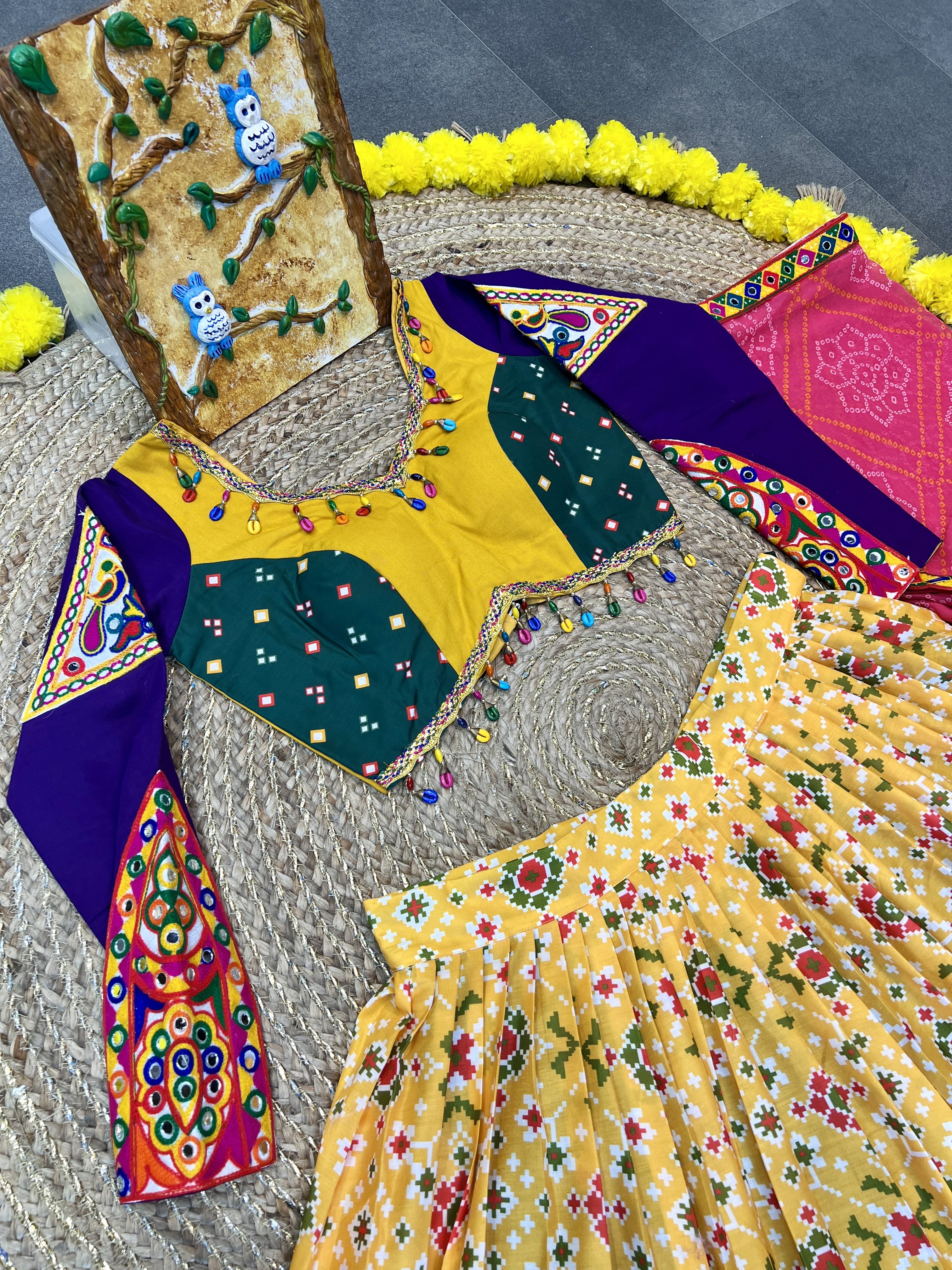 Traditional Style Yellow Color Maslin With Patola Print Premium Navratri Couple Wear Lehenga Choli