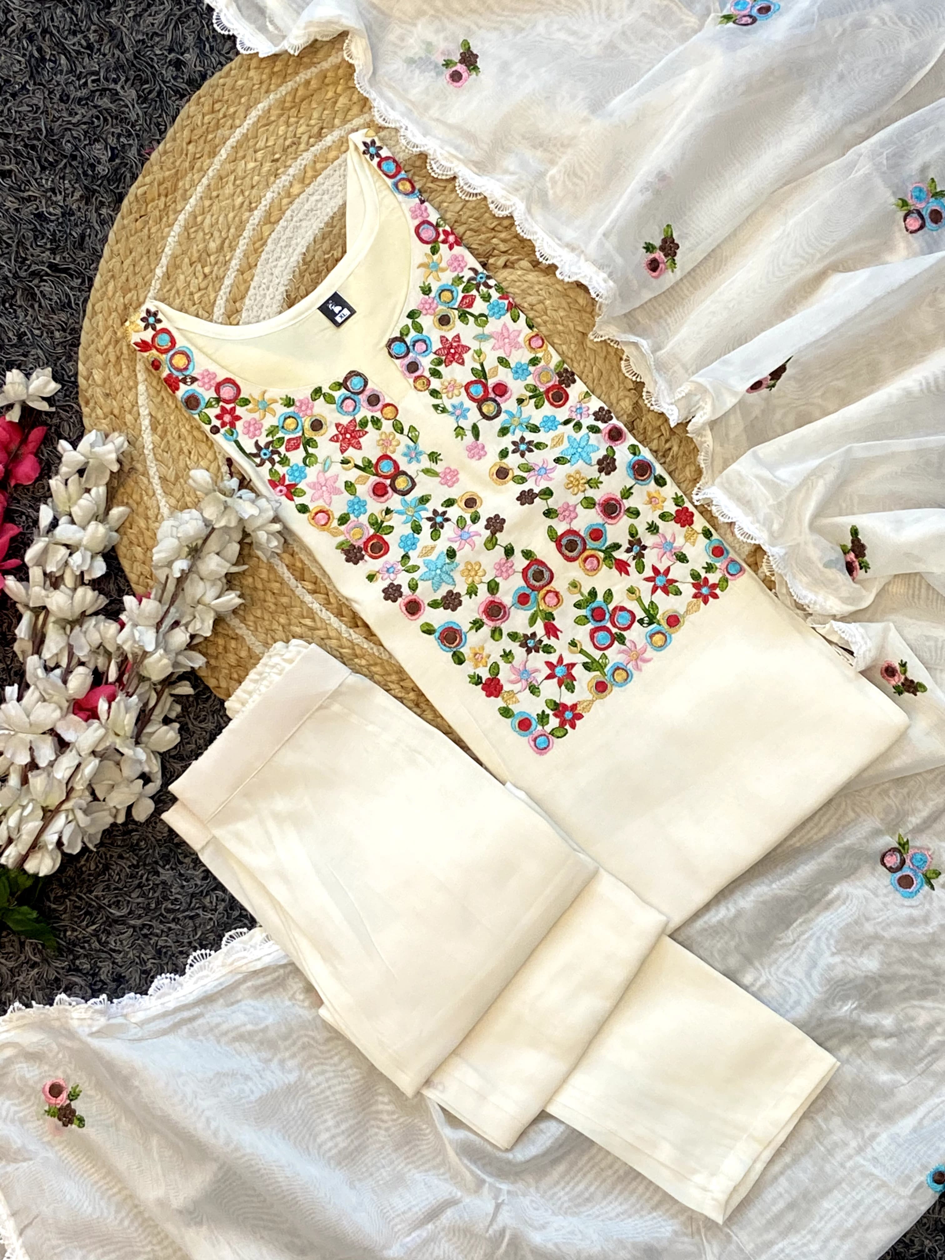 Women's Designer Viscose Chanderi Top With Bottom & Cotton Dupatta Kurti With Pent