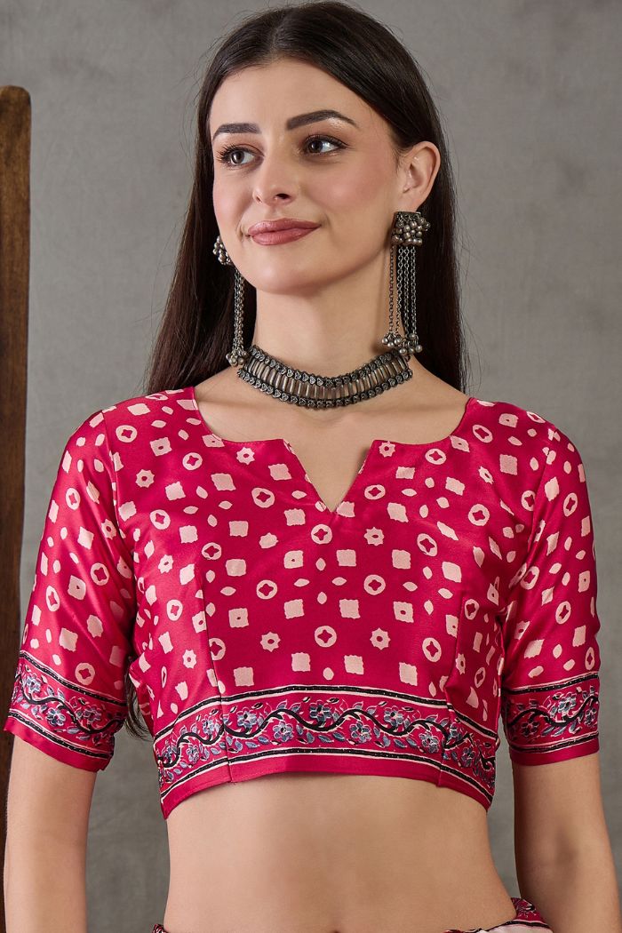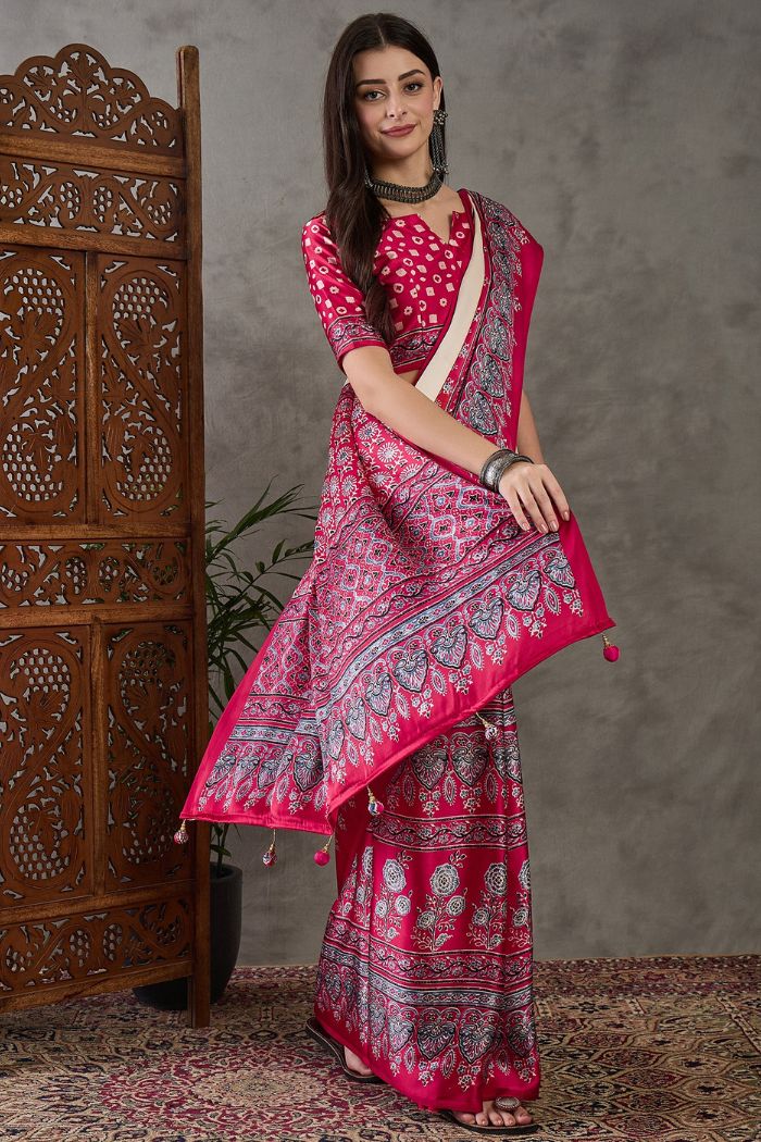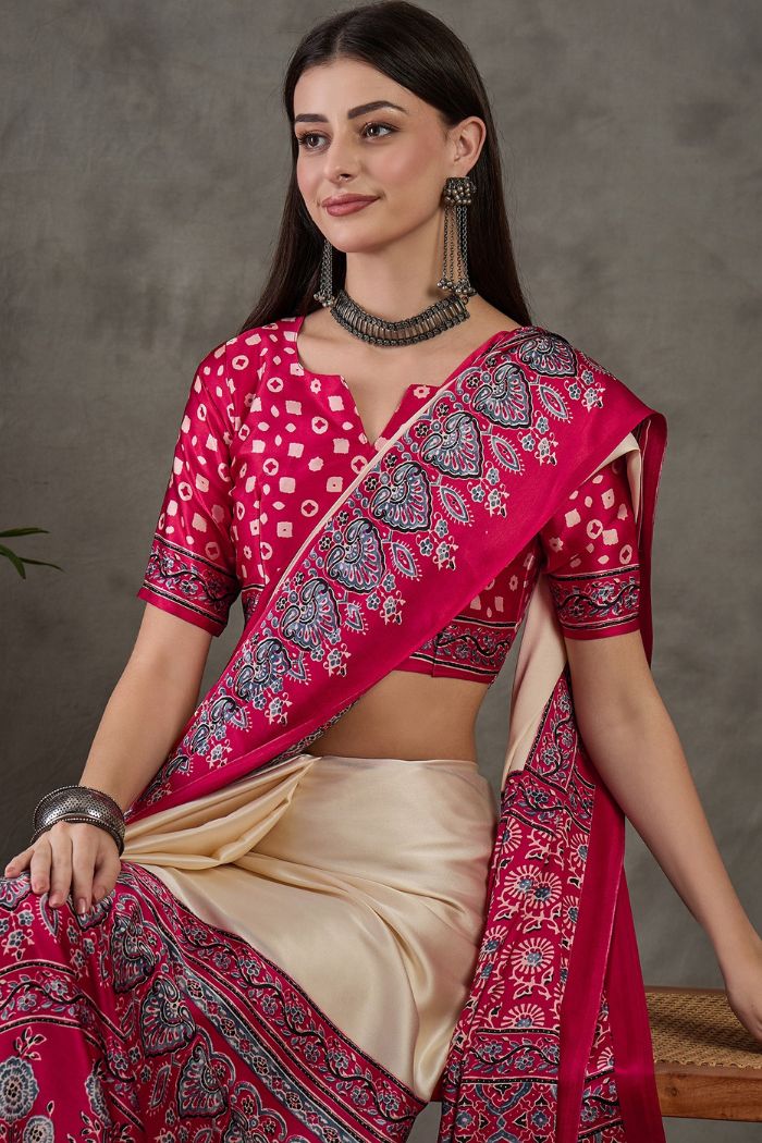 Cream and Red Pure Soft Modal Satin Ajrakh Print Satin Saree