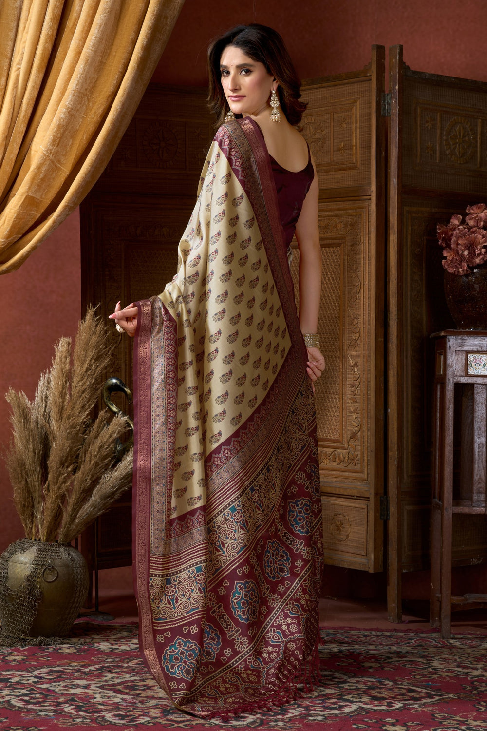 Cream Pure Cluster Silk Ajarkh Digital Printed Saree