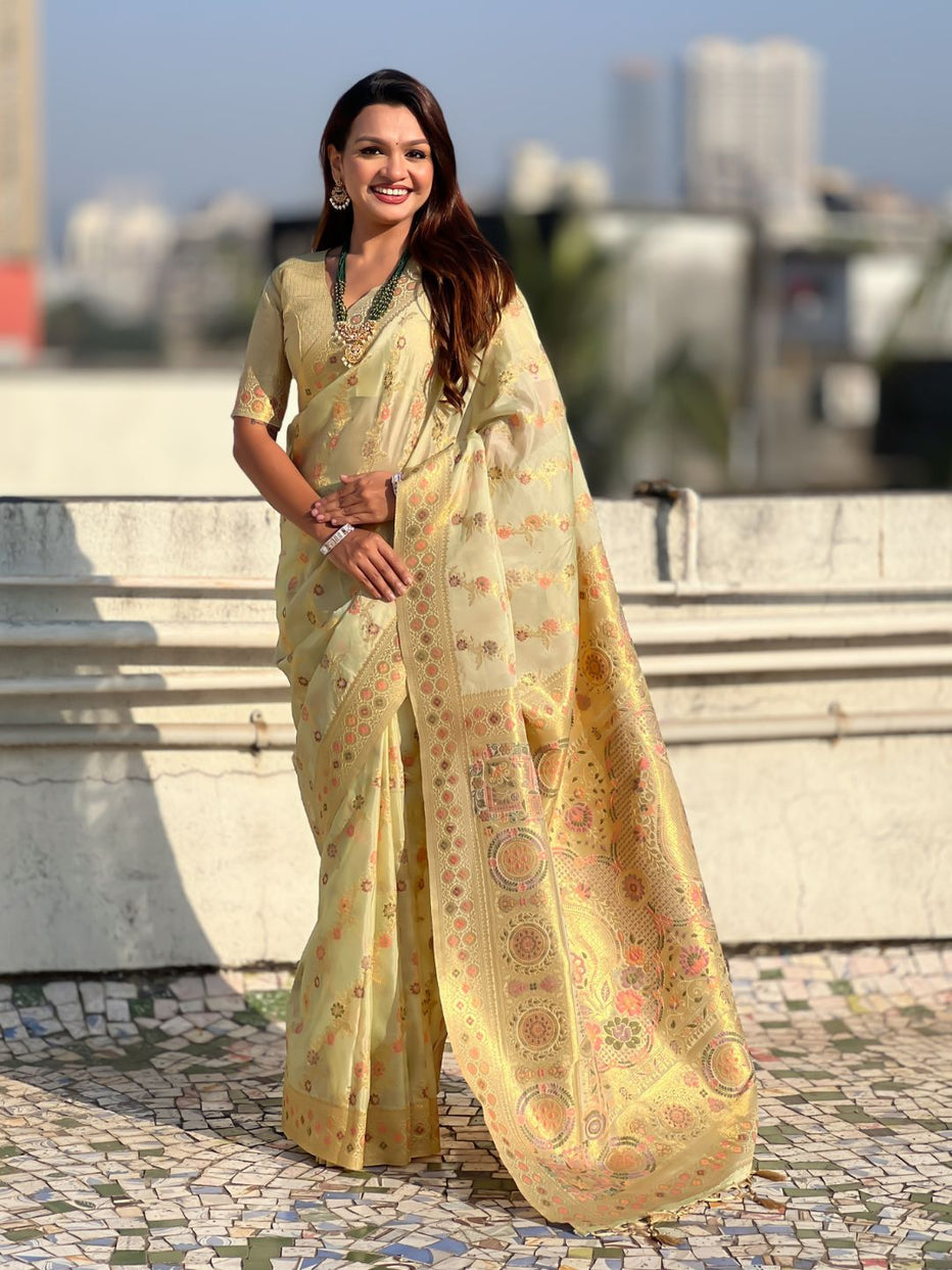 Cream Pure Kora Silk Leheriya Meenakari Weaves Kora Silk Saree