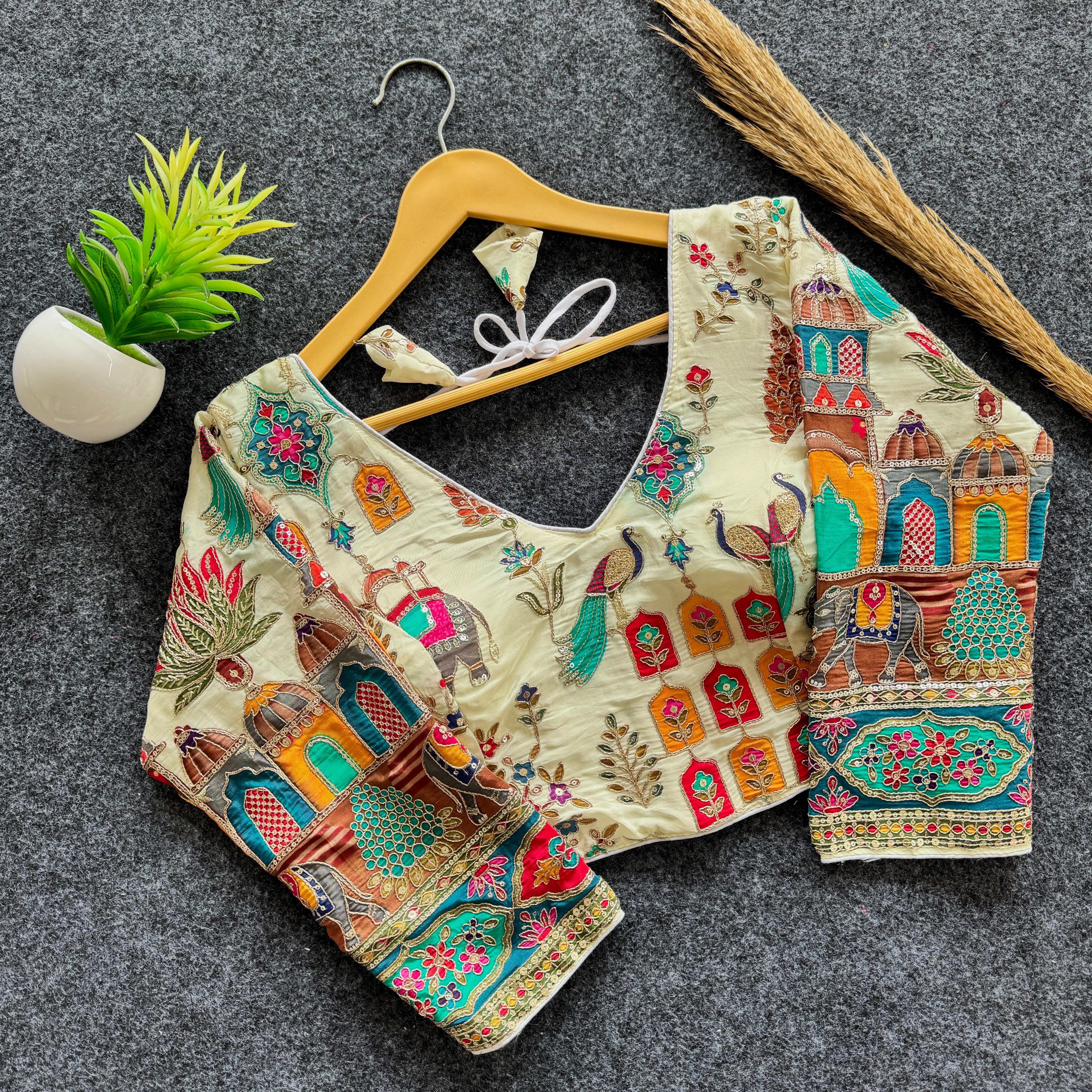 Cream Pure Silk Heavy Embroidery Flower Print Wedding Blouse