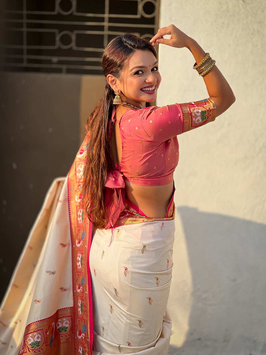 Cream Soft Silk Swan Rajhans Paithani Saree