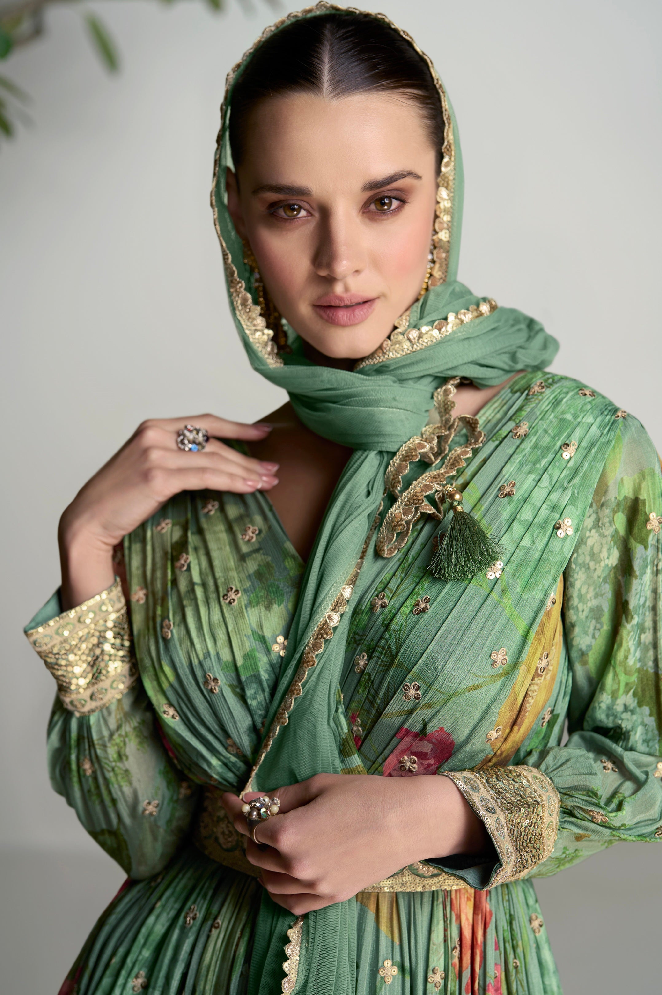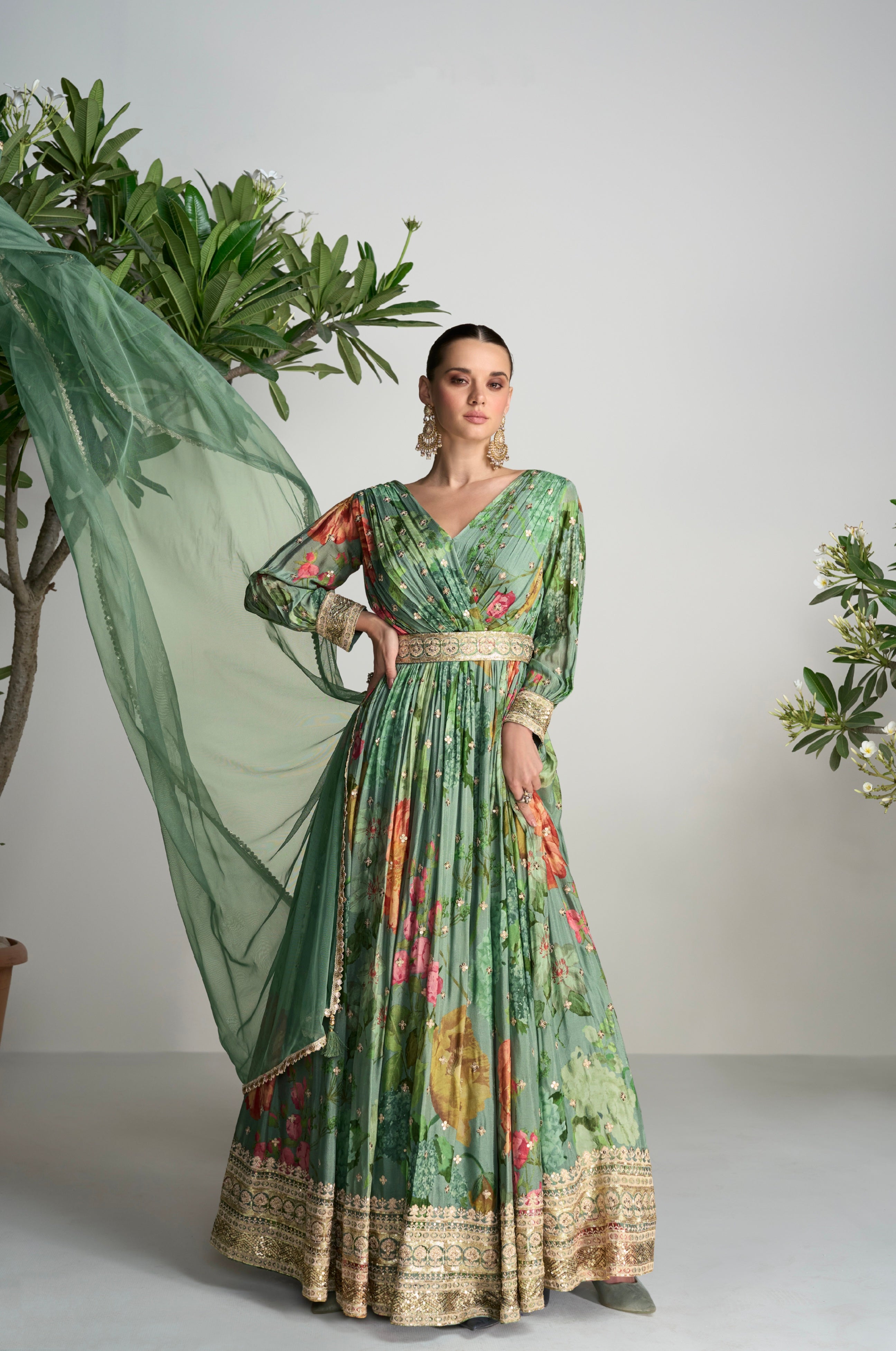 Dark Green Floral Anarkali Suit in Real Chinon & Natural Creap with Soft Net Dupatta