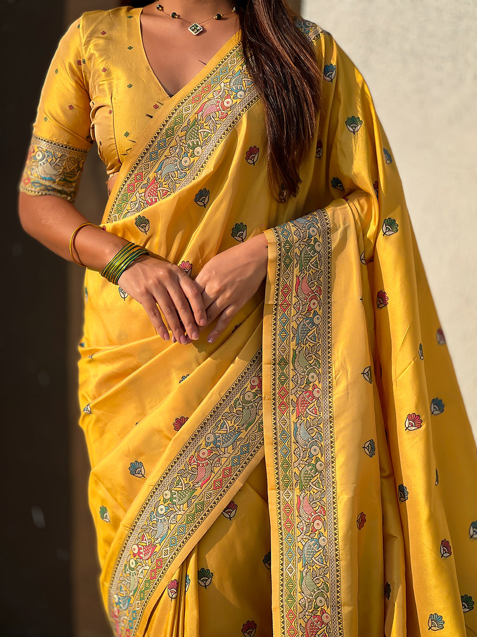 Dark Yellow Pure Soft Baluchari Silk Zari Meenakari Saree