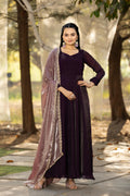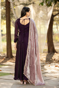 This elegant space silk gown features a flared silhouette and details on the sleeves, adding texture and sophistication. Paired with a contrast-colored zari embroidered and scalloped border dupatta, it enhances the overall look with intricate, shimmering designs, making it a perfect choice for a special occasion