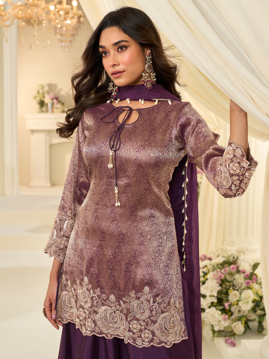 Deep Wine Purple Premium Chinon Silk Beads Work Palazzo Suit