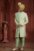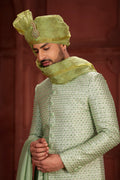 This teal and gold lehenga features intricate embroidery and mirror work, paired with a pink dupatta for a stunning, regal look.