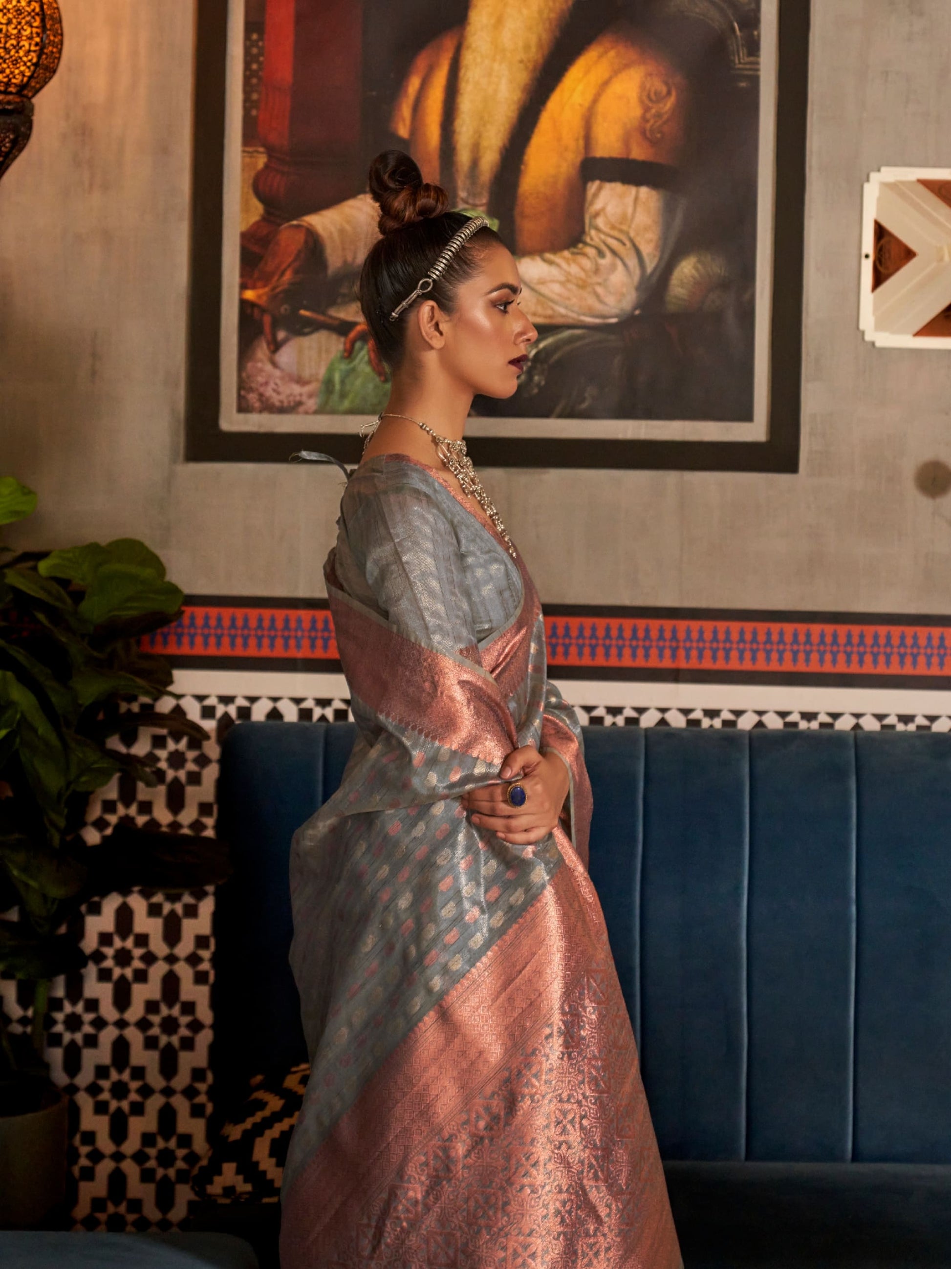 This dusty blue tissue silk saree features exquisite gold and silver zari handloom detailing that adds a refined shimmer. Its lightweight fabric and elegant drape ensure comfort while lending a sophisticated touch, making it an ideal choice for festive occasions and celebrations. Crafted with expert precision, this saree embodies timeless beauty and grace.