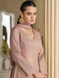 This dusty pink Anarkali gown, made from premium georgette, combines grace and sophistication with intricate embroidery highlighted by sparkling Seroski and Zarkan accents. The matching dupatta enhances its traditional charm, making it an ideal choice for engagements, mehendi ceremonies, and festive celebrations.